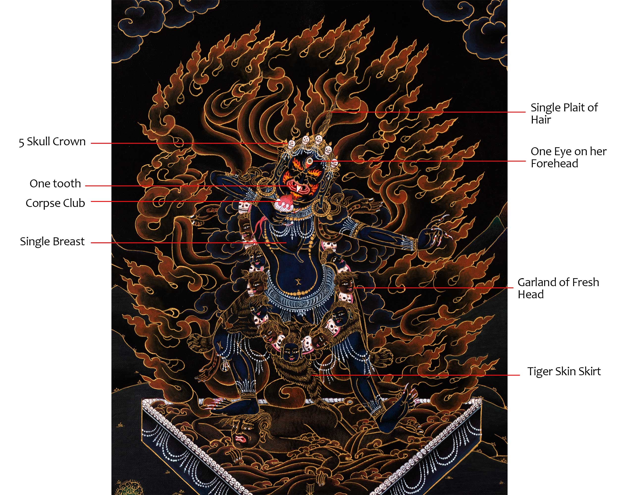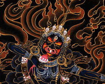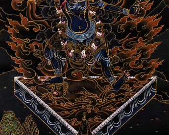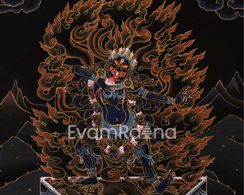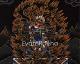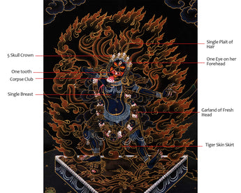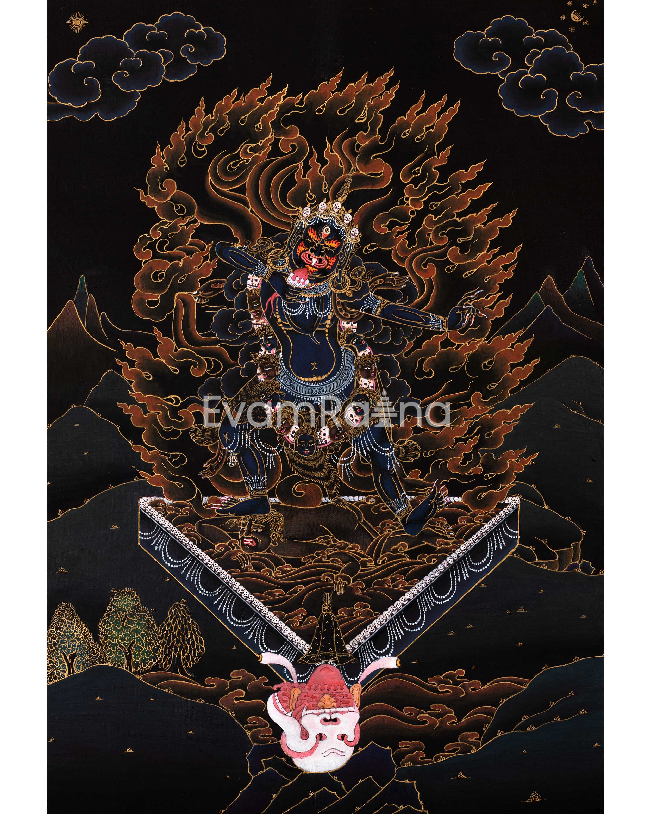A Blue Ekajati thangka painted in pure gold on a black background is a stunning and rare piece of art. The use of pure gold for the painting has make it visually striking but also symbolically significant, as gold is often associated with the highest spiritual offerings.