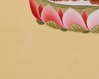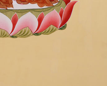 Beautifully portrayed in the Blue Healing Buddha Thangka, Bhaisajyaguru, also known as the Medicine Buddha, is renowned for his ability to cure spiritual and physical illnesses. He has a deep blue body, representing the light of lapis lazuli - a color that symbolizes purity, healing energy, and boundless compassion. Positioned in a vajra pose on a vibrant pink lotus base, he holds a healing bowl filled with nectar in his left hand, resting on his lap. In his right hand, he extends a branch of the Myrobalan plant, a sacred medicinal herb believed to cure all inner and outer ailments. It is meticulously painted on cotton canvas in the traditional Tibetan style, with its beauty and spiritual significance enhanced by the use of genuine 24K gold and acrylic colors.
