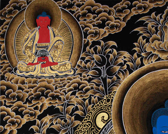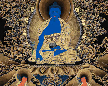 This Medicine Buddha Thangka, accompanied by Amitabha Buddha and Shakyamuni Buddha, can transform your living or working space with healing, inspiration, and cultural significance. It also showcases Tibetan Buddhism's rich cultural heritage. Its vibrant colors and intricate details add artistic elegance, sparking conversation and promoting healing, compassion, and spiritual growth.