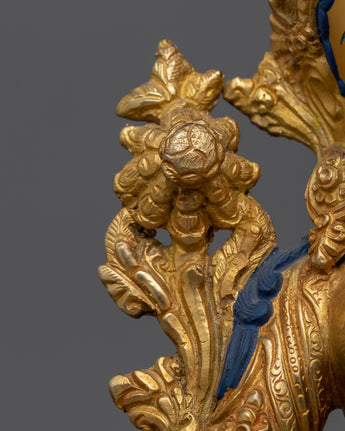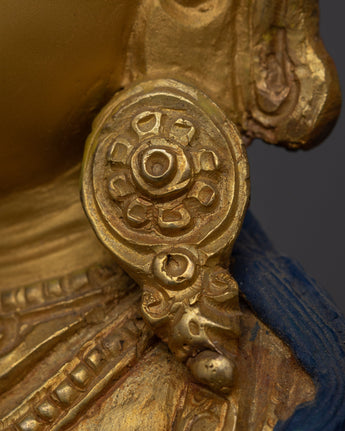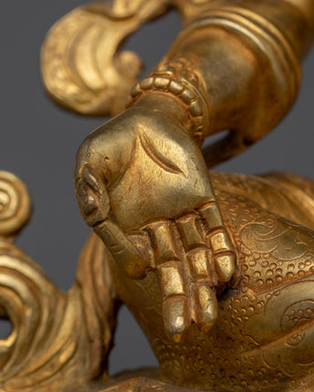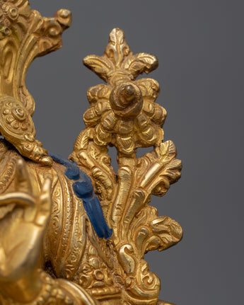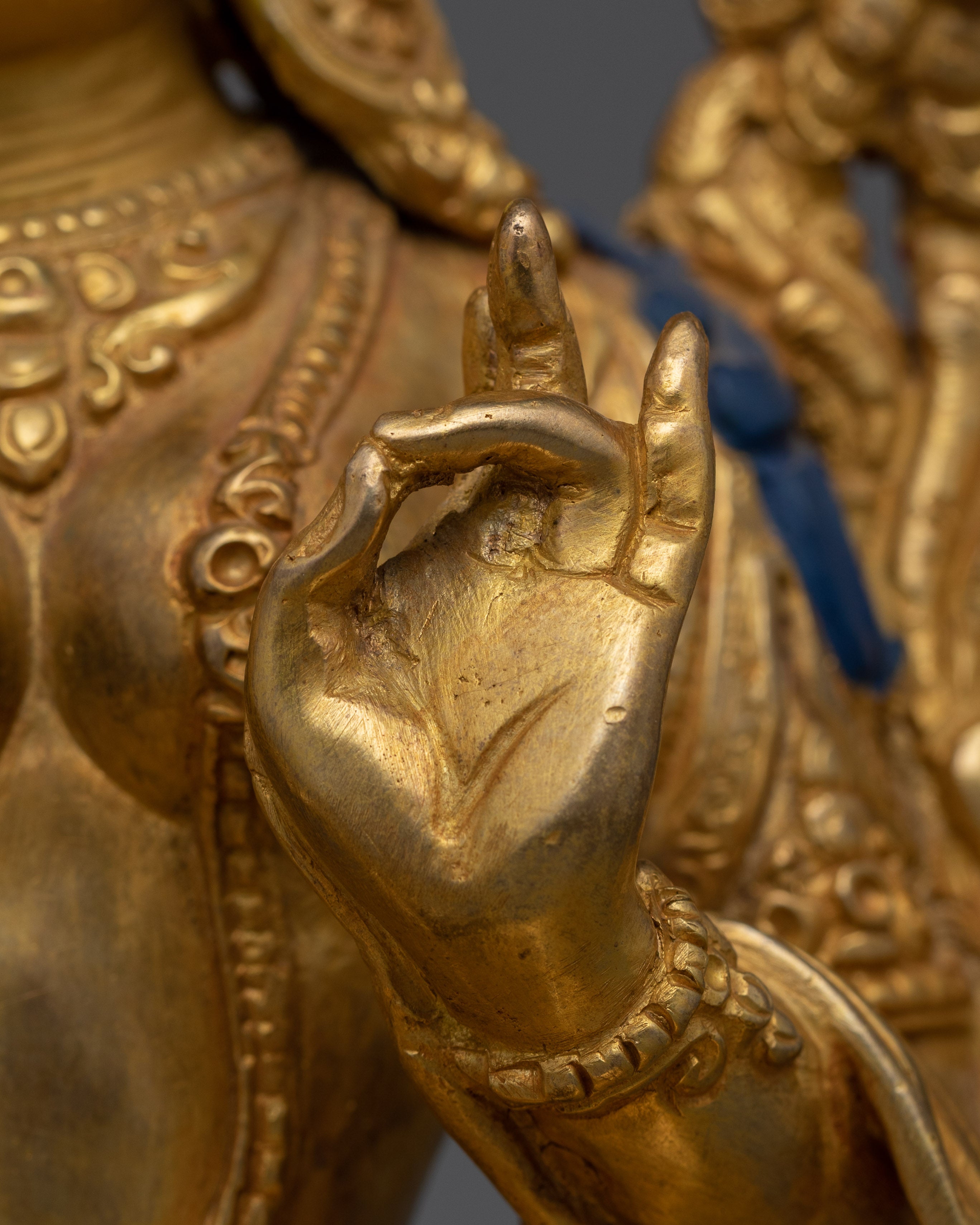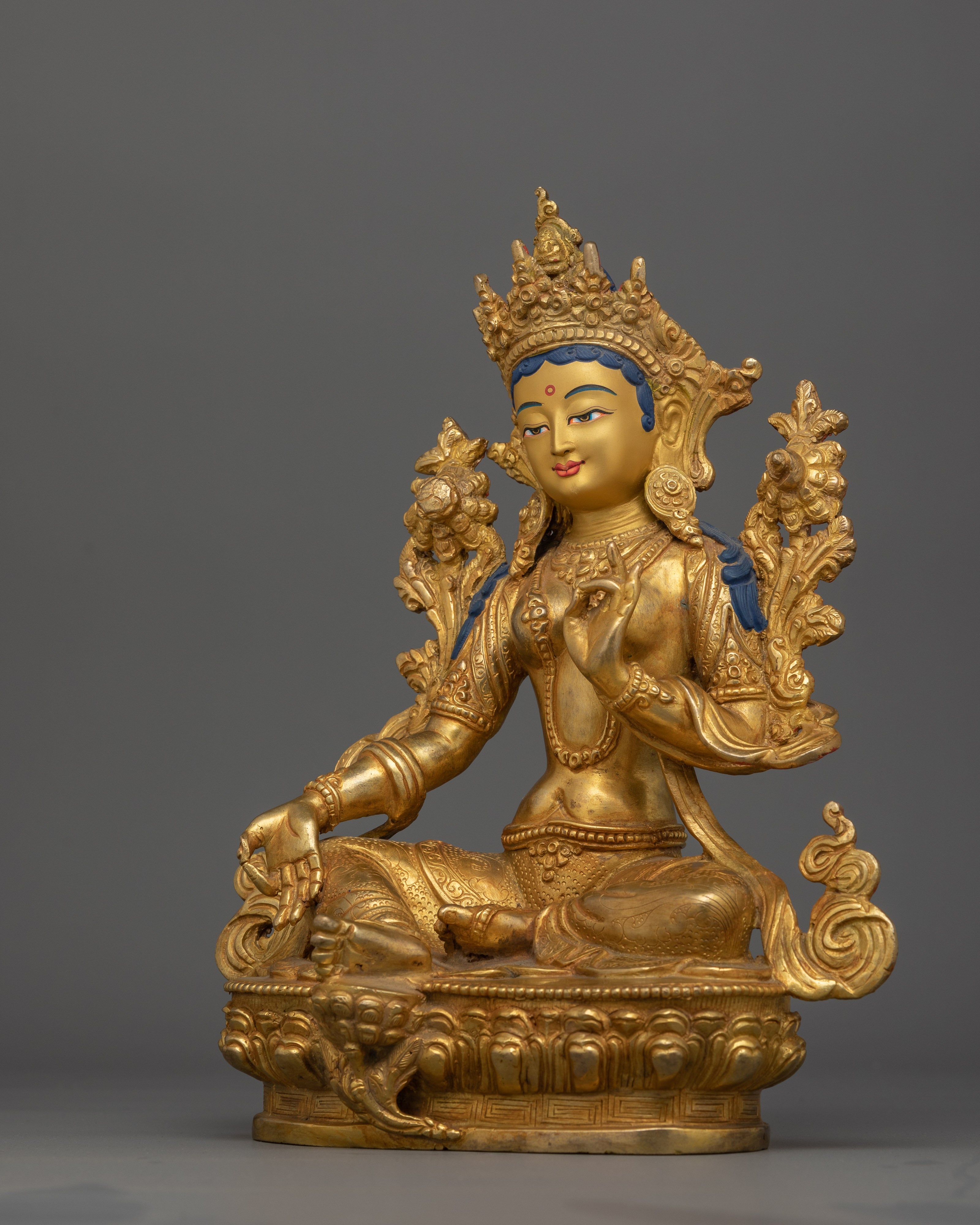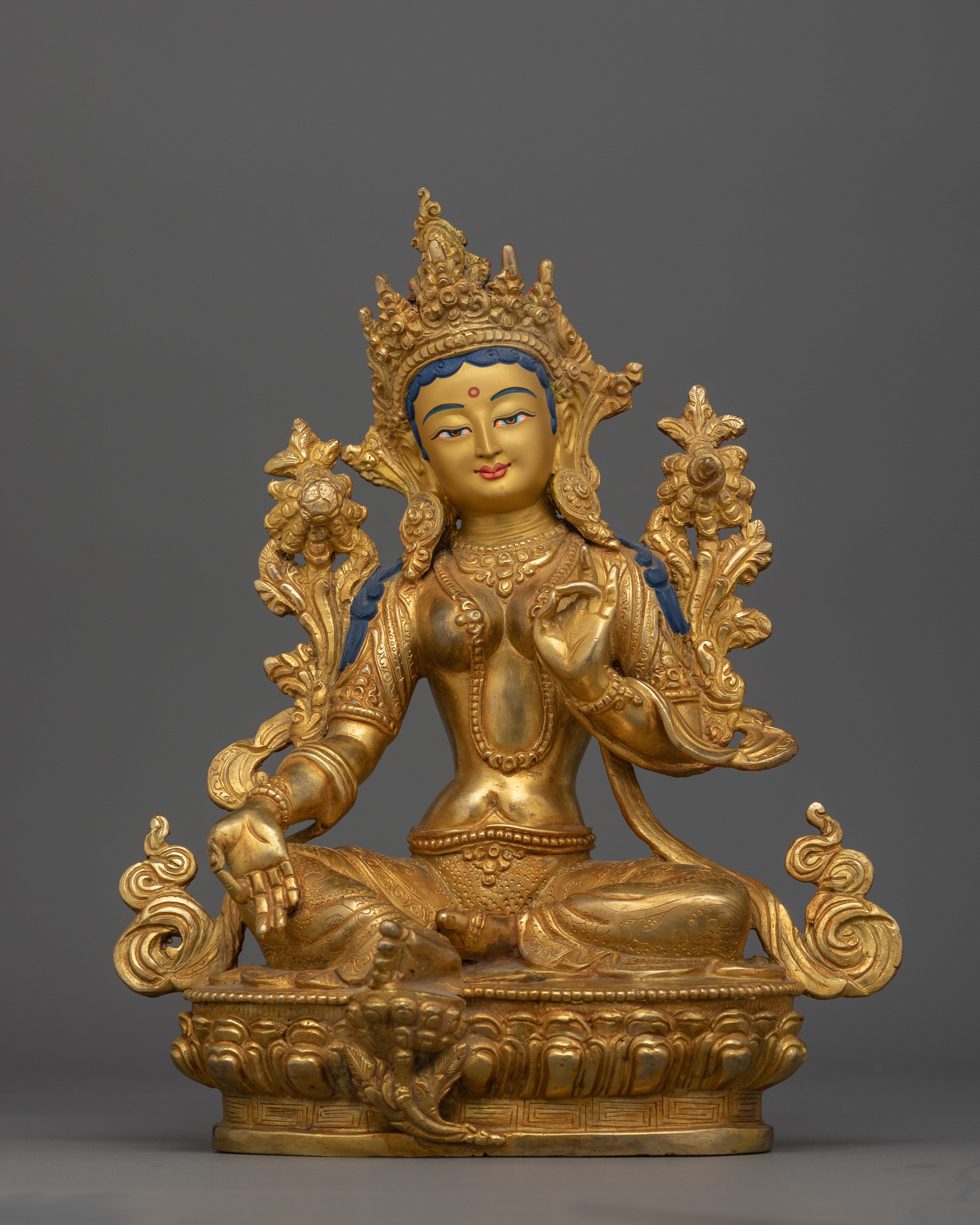 As depicted, Green Tara is shown seated on a lotus throne with her right leg typically extended forward, signifying her active compassion and willingness to help. Her hands express profound meaning through their gestures; the right hand is displayed in the "gesture of giving" (Varada Mudra), symbolizing her boundless generosity and willingness to provide blessings. Meanwhile, her left hand delicately holds a blue lotus (Utpala), a symbol of purity and spiritual awakening. offering protection and reassurance to those who seek her guidance.