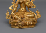 Green Tara, also known as Syamatara, is a highly adored deity in Tibetan Buddhism who represents active compassion and prompt help. She is referred to as the "Mother of Liberation and is invoked to remove impediments, protect from harm, and soothe anxiety and pain. Breen Tara is generally represented as a lovely young woman with a calm smile. seated with one leg outstretched and poised to spring into action, holding a blue lotus, which represents purity and compassion. Her methods are centered on developing compassion, obtaining protection, and conquering personal and external challenges.