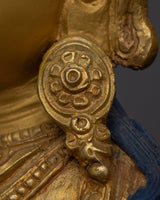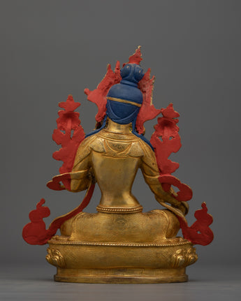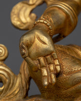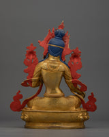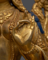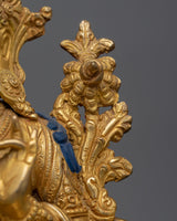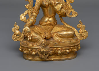 In Tibetan Buddhism, the Green Tara compassion goddess is revered as a manifestation of compassion and protection. This beautiful statue, measuring 9.4"/24cm in height and 8.1"/20.5cm at the base and weighing 2.23 kg, is made of copper with a 24K gold gilding. It includes beautiful gold and acrylic paintings that highlight Tara's divine beauty and commanding presence. This statue is an excellent addition to any spiritual space, bringing both serenity and healing energy to any shrine or altar.