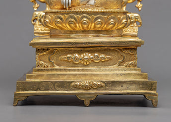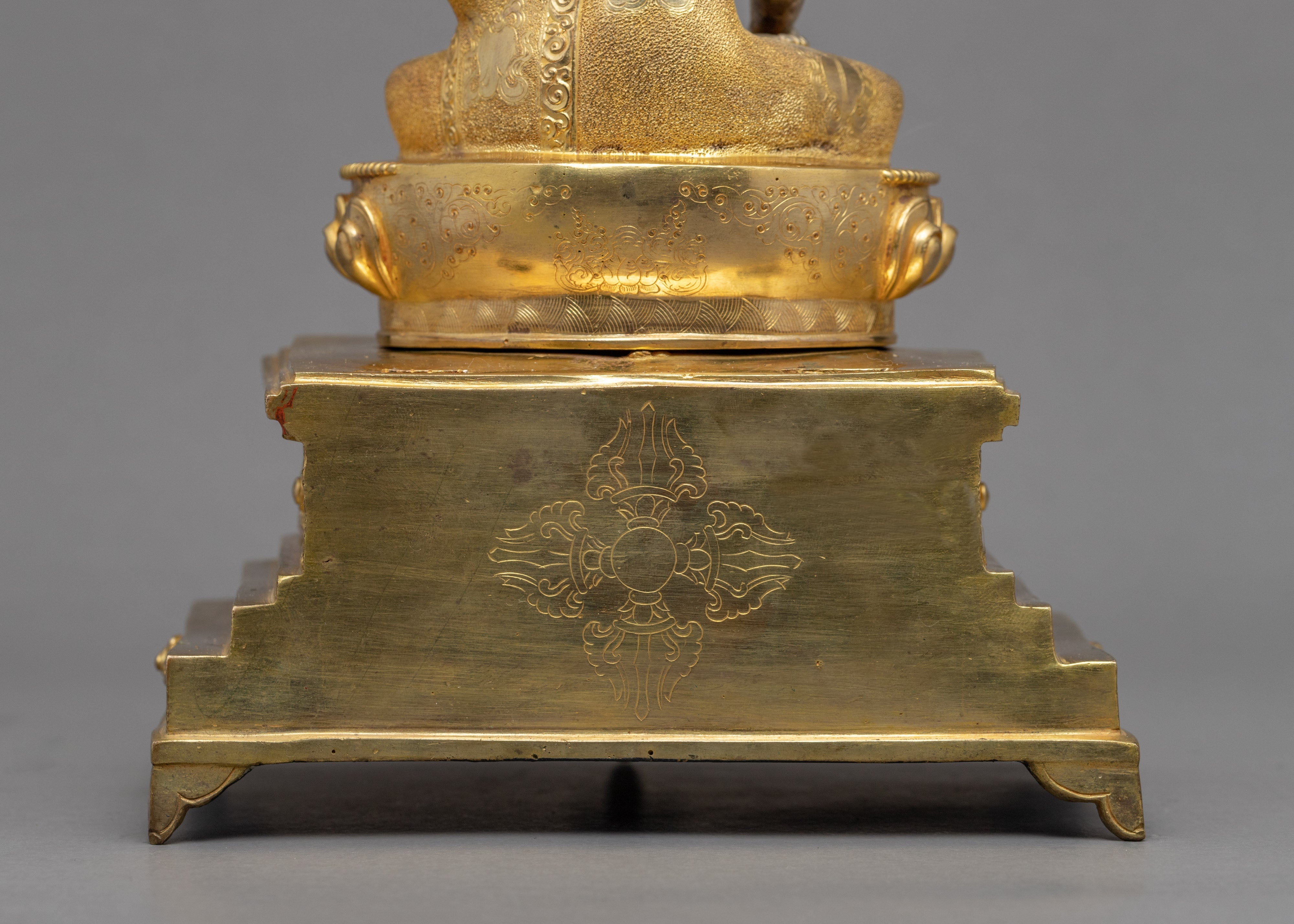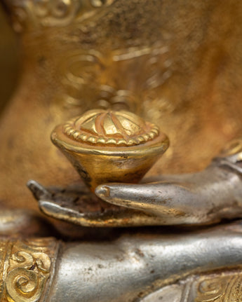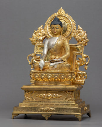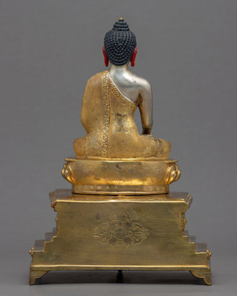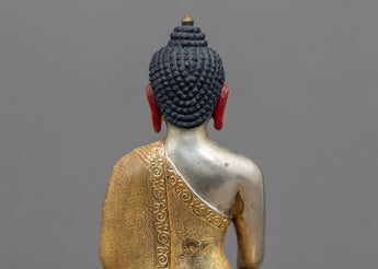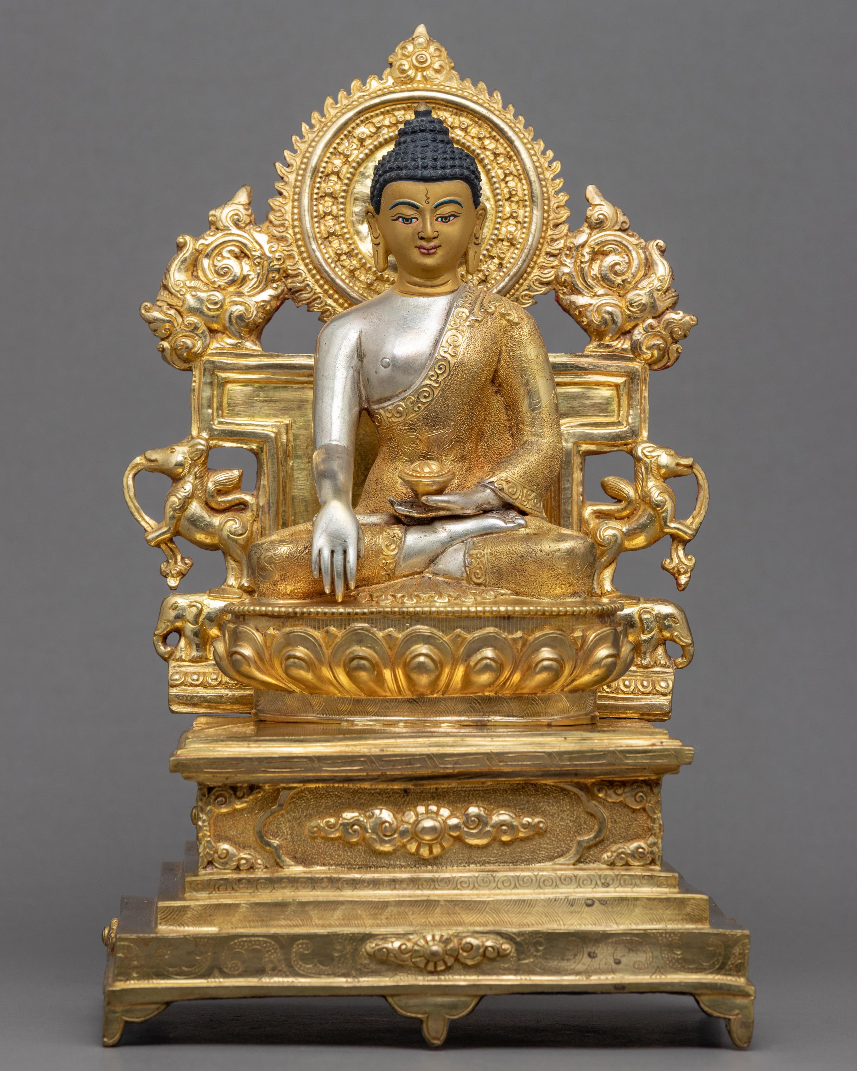 We have beautifully crafted the Bodhgaya Buddha Shakyamuni Statue in our studio with the skillset and technique inherited over centuries. This is a unique art craft as it is molded using copper and has gold gilding and silver plating. We have silver in the body, while the rest of the figurine includes a face, and the throne itself has been gilded with genuine 24K gold. In this statue, we have depicted the deity seated on a handmade lotus throne set. We have spent months and months with complete devotion to crave this statue set of Historical Buddha. The deity is shown in a cross-legged pose while seated on the throne. He does the earth-touching mudra with his right hand, representing his gained Enlightenment while holding an alms bowl in his left and right hands.