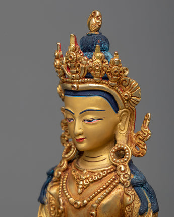 Introducing the Bodhisattva Amitayus Sculpture, a luminous symbol of long life and knowledge. This sculpture, which stands 9 inches tall and has a base width of around 6.2 inches, combines spiritual depth and artistic refinement. Weighing 1.41 kg, it is precisely created from a copper body, adorned with 24K gold plating, and embellished with gold and acrylic paints, offering a work that sparkles with the promise of eternity and enlightened understanding.
