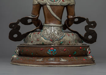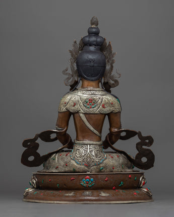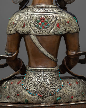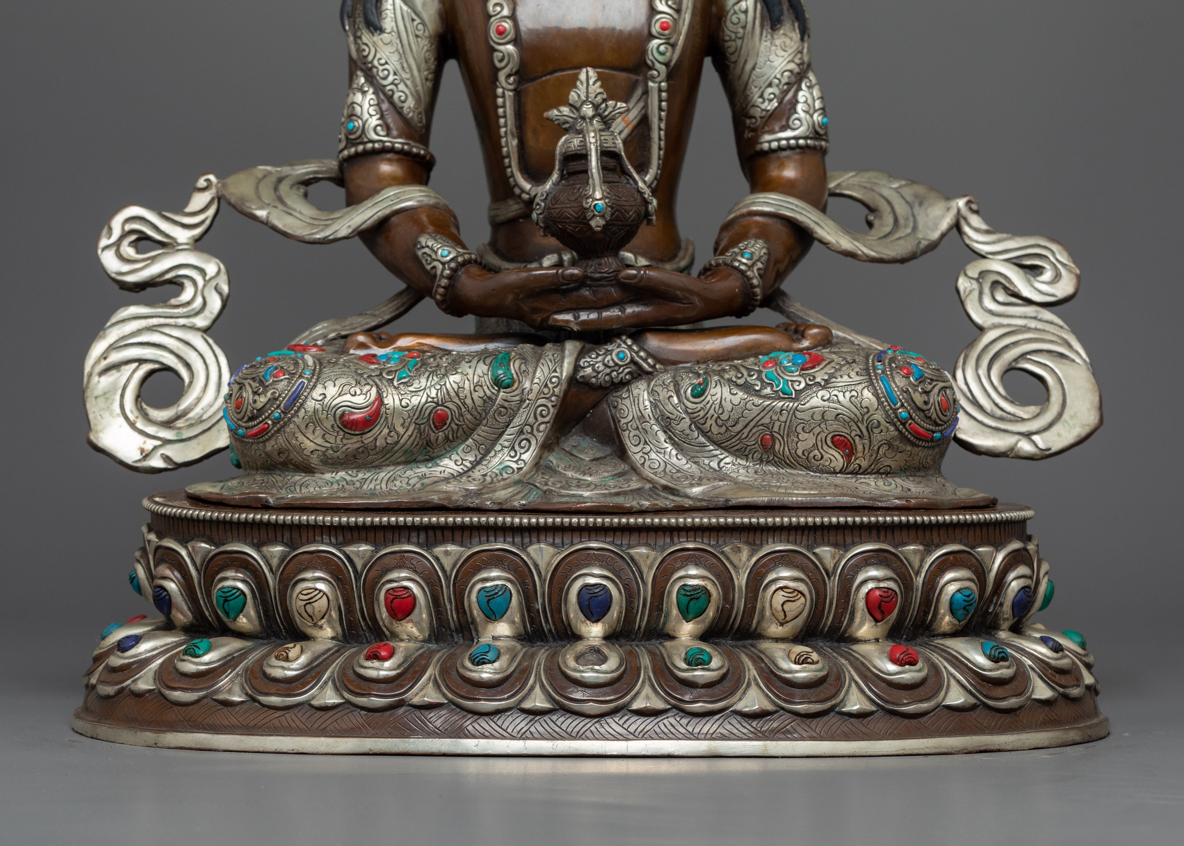 The dazzling silver plating brings out the exquisite features of Aparamita's tranquil countenance and symbolic gestures, which contrast nicely with the deep, rich tones of the oxidized copper. The addition of hand-carved gemstones adds an element of earthly beauty to the divine figure, symbolizing the illuminated path of enlightenment that Aparamita guides followers along. This statue not only serves as a focal point for devotion but also as an inspiration for those on the spiritual journey toward ultimate liberation.
