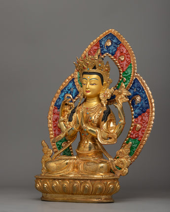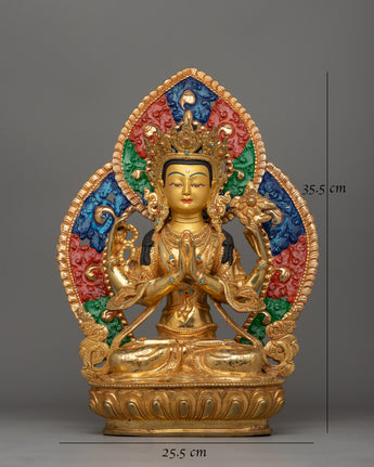 The Bodhisattva Chenrezig statue is 35.5 cm tall and 25.5 cm wide, made of copper and elegantly gold-plated. Chenrezig, known as the embodiment of compassion in Tibetan Buddhism, is depicted here in a serene seated posture, his hands clutching into a wish-fulfilling jewel, symbolizing the offering of compassion to all beings. His posture exudes calm and love, emphasizing his role as a protector of sentient beings. An intricately designed halo surrounds the figure, and bright acrylic colors highlight the design's brilliance. This vibrant halo, adorned with red, green, and blue colors, gives the piece an incredible sense of divine radiance.