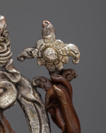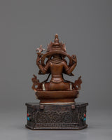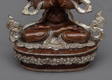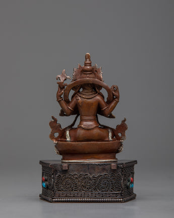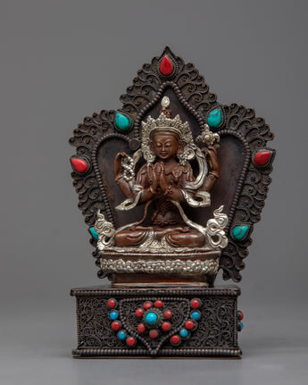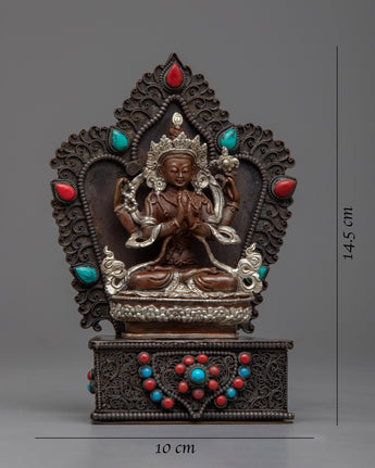 The Bodhisattva Chenrezig Statue is machine-made on a copper body, ensuring exact craftsmanship and attention to detail. Despite its small size (14.5cm tall), this statue beautifully depicts the compassionate energy of Bodhisattva Chenrezig. It feels substantial in your hand, with a weight of 0.376 kg, symbolizing the spiritual significance of the deity it depicts. The copper material gives the statue a touch of elegance and durability, making it a meaningful addition to your spiritual practice or a thoughtful gift for fellow practitioners.