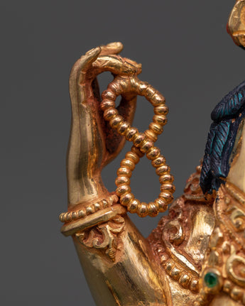 The deity is represented sitting on a moon-disc lotus throne. A crystal rosary in the upper right hand represents the never-ending cycle of life, death, and regeneration. The upper left-hand holds a lotus, symbolizing the deity's role in helping mankind escape adversity and unfavorable conditions, including hellish realms. The lower hands are softly placed in a namaste motion, clutching a wish-fulfilling Jewel. The deity's peaceful and calm visage conveys compassion and tranquility.