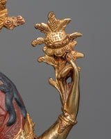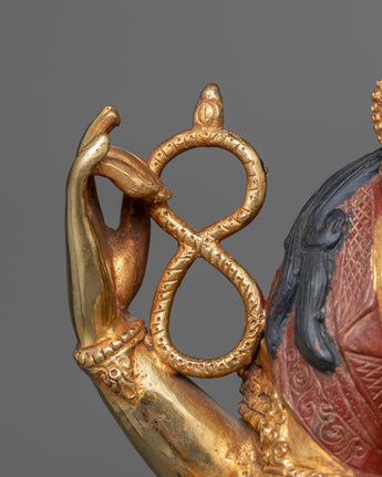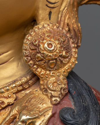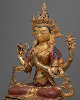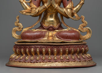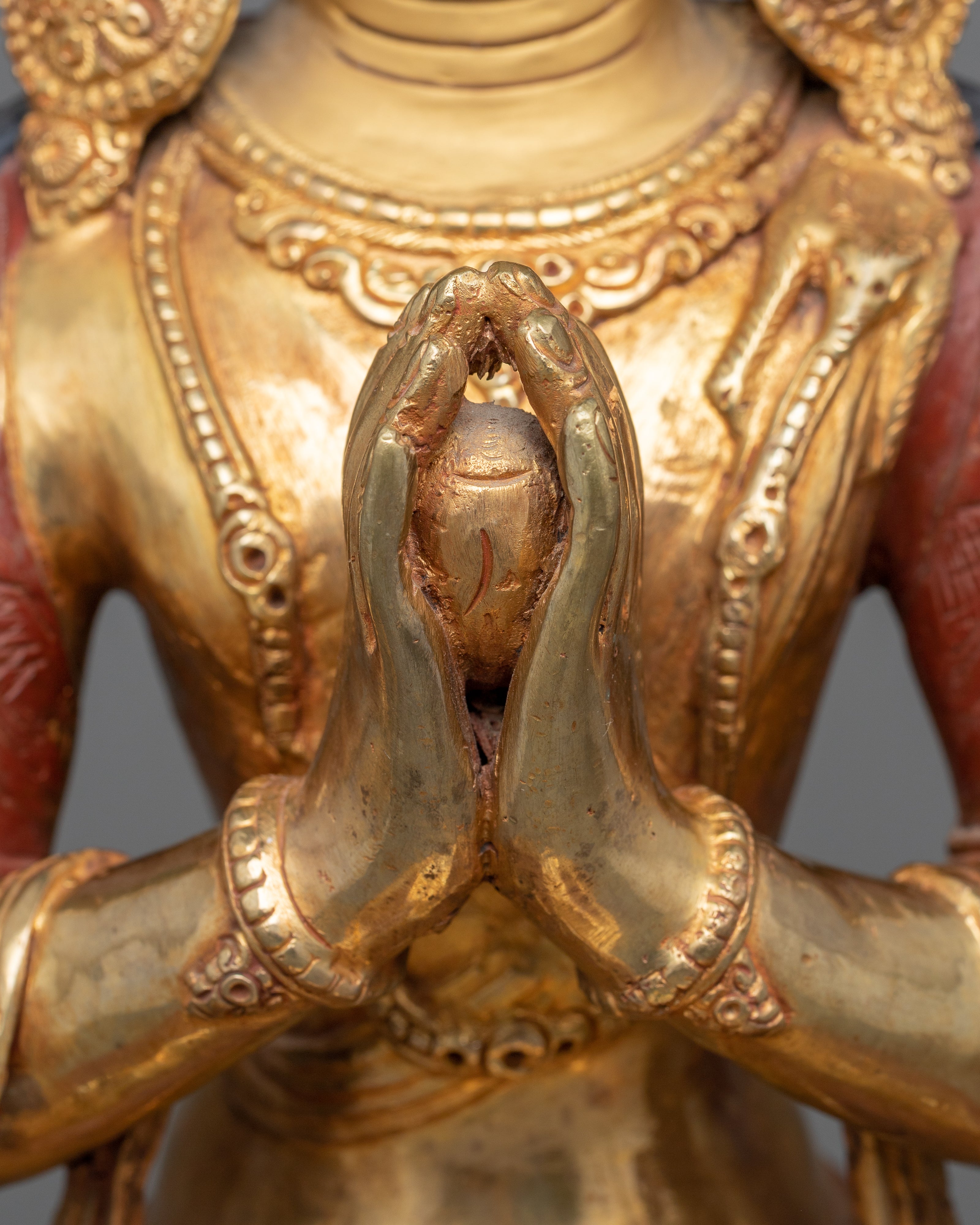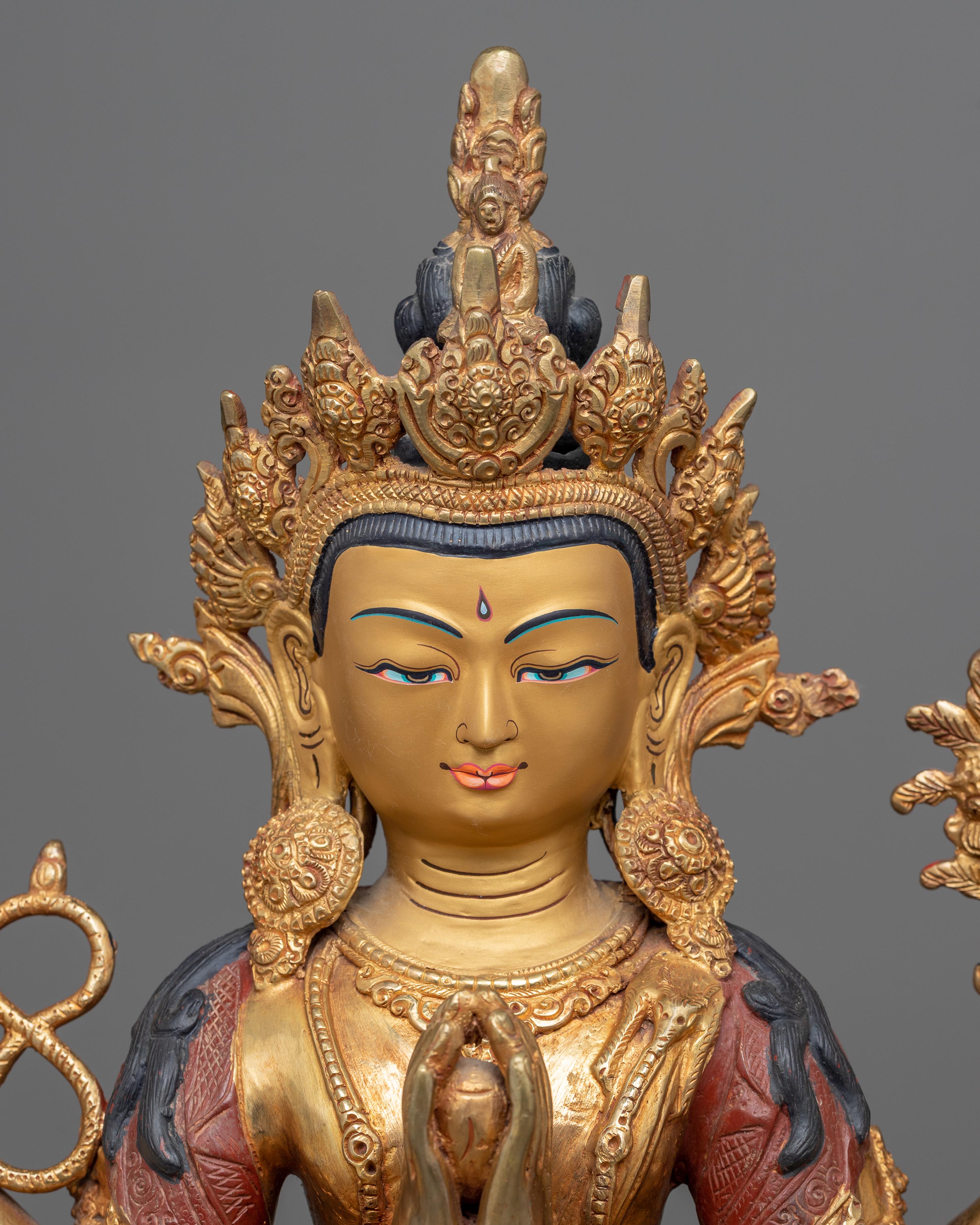 Standing at 18.5 Inches tall, the statue of Chenrezig weighs 8.53kg. The statue is sculpted on a copper body and gilded in genuine 24k gold. Nepali artists sculpted this statue and hand-carved it in the traditional Himalayan art of Nepal. The deity is depicted in his upper-right hand, he holds a crystal rosary, and in his upper-left hand, he holds a lotus. In his lower hands is a wish-fulfilling jewel. He is sitting atop of lotus seat with a calm expression.