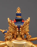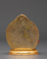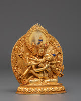 The Bodhisattva Deity Guhyasamaja with His Consort Statue is a potent emblem of wisdom, compassion, and spiritual harmony. This finely sculpted statue, 13cm tall and 10cm wide, is constructed of copper and gold-plated to enhance its holy aura. Guhyasamaja, the embodiment of profound insight and compassion, is shown in a harmonious stance with his spouse, symbolizing the marriage of wisdom and skilled ways. The delicate decorations and golden finish enhance the deity's sacred character, making it a must-have for any altar or meditation room.