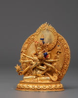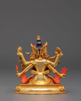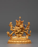 Guhyasamaja, which means "Secret Assembly," is an important figure in Tantric Buddhism. He symbolizes the underlying truths of Buddhist teachings by representing the synthesis of form and emptiness. With many arms and embracing a consort, his complex iconography depicts the union of wisdom and method, a major element in Vajrayana practice. Guhyasamaja's profound essence is captured in this statue, which serves as an embodiment of spiritual knowledge and transformation.