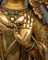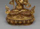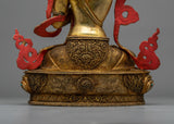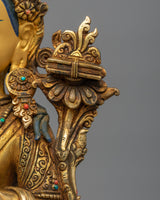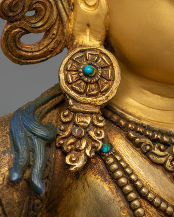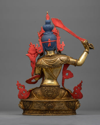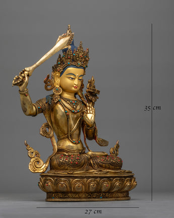 Our Bodhisattva Deity Manjushri statue is a monument to talent and devotion, with its fine craftsmanship. Crafted from copper and embellished with 24K gold gilding, every element showcases the proficiency of handmade methods. The carefully sculpted facial features, flowing robes, and symbolic themes are intended to arouse feelings of peace and enlightenment. This statue, enhanced by paintings in gold and acrylic, exudes a mystical atmosphere that appeals to people who are searching for knowledge and the truth.