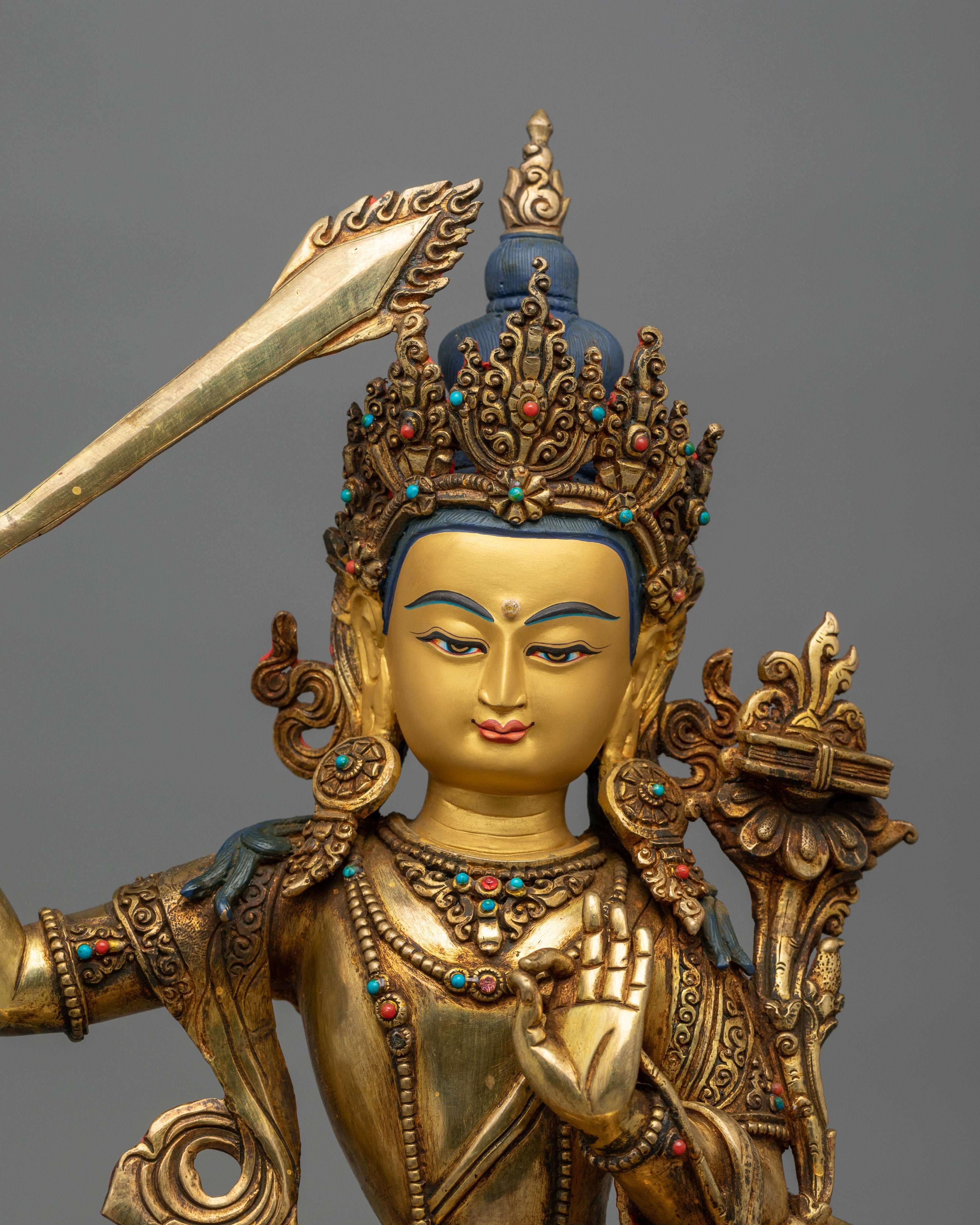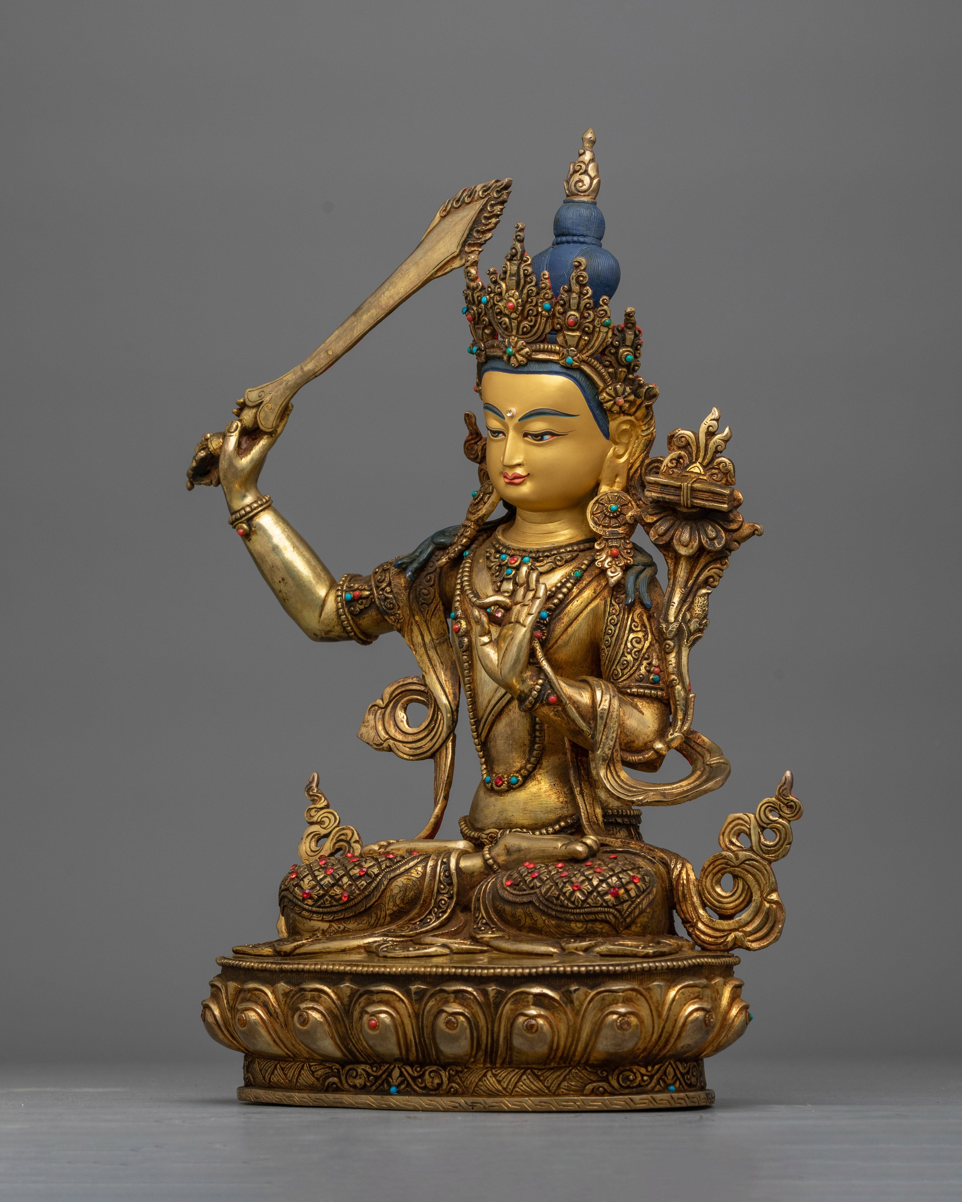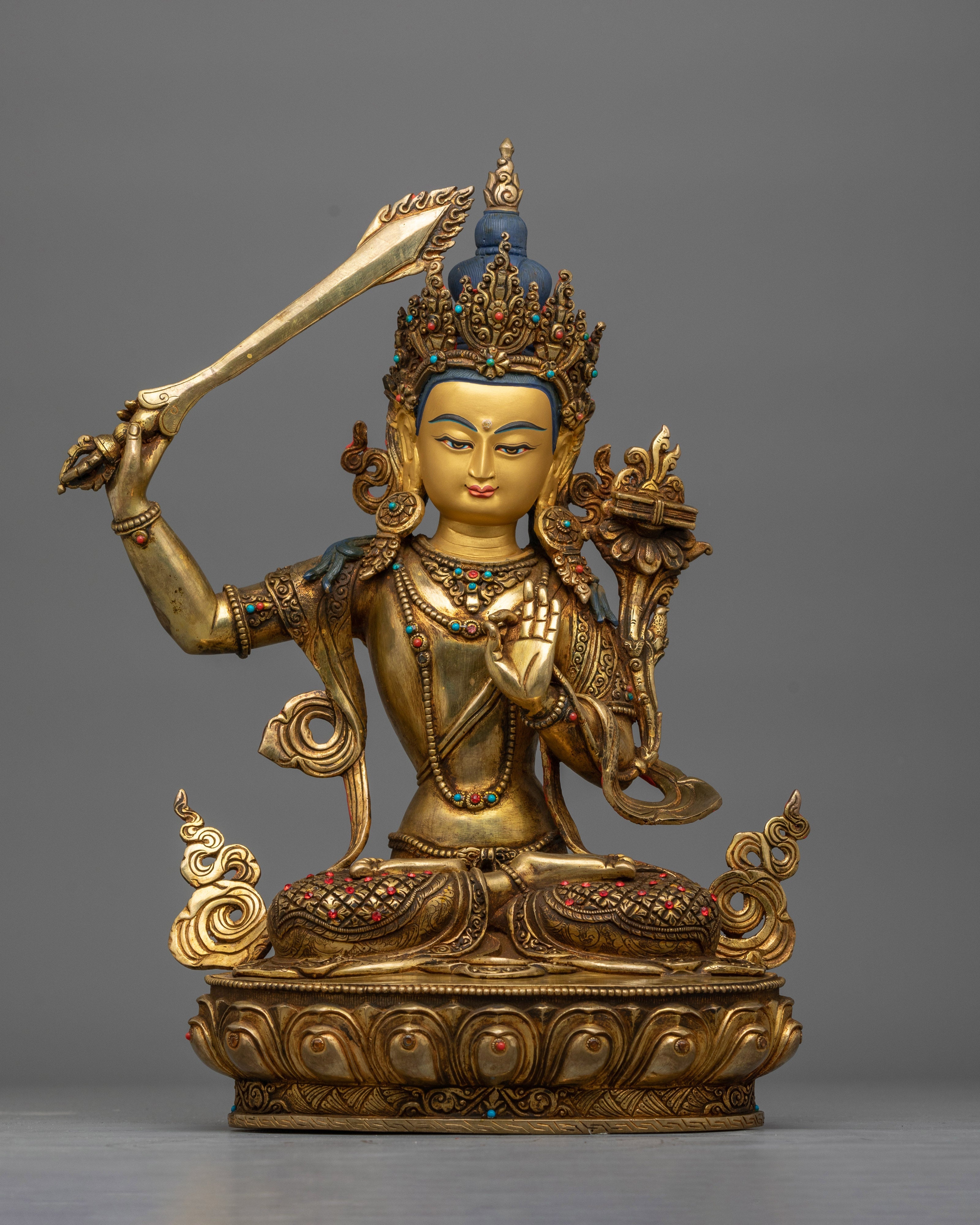 The Mahayana Buddhist deity Manjushri is venerated for embodying insight, wisdom, and the realization of emptiness. He is frequently seen brandishing a sword of wisdom, signifying the capacity to sever ignorance and illusion. The development of knowledge and discernment is emphasized in Manjushri's teachings as a necessary step towards enlightenment. Through study, meditation, and reciting his mantra, "Om Ah Ra Pa Tsa Na Dhi," devotees call upon his blessings. Manjushri is a Bodhisattva who personifies the selfless desire to end the suffering of all living things. His kind advice encourages practitioners to get a deeper comprehension of reality and recognize its actual essence.
