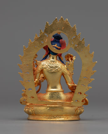The divine grace of our Female Bodhisattva Green Tara Statue, a fusion of spiritual symbolism and modern craftsmanship, is revealed. Its copper body is machine-made for precision and adorned with a luxurious electro-gold plate, creating a mesmerizing blend of tradition and contemporary artistry.