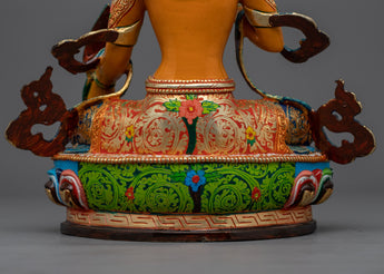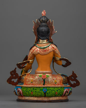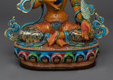 This Bodhisattva Kshitigarbha Figurine depicts the Bodhisattva of Compassion and Protector of Souls. Standing 13.8 inches tall with a base width of 10.8 inches, this precious artwork weighs 4.04 kilograms. The statue, made of copper, is embellished with bright 24K gold gilding and detailed gold and acrylic paintings, which add to its outstanding visual impact and spiritual importance.