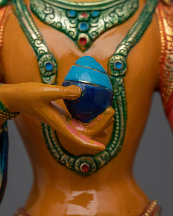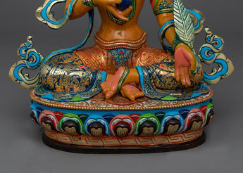 Kshitigarbha, famed for his commitment to helping creatures in the six realms of existence, is shown here holding the Cintamani, a wish-fulfilling jewel. This spiritual artwork is ideal for improving your meditation altar, or Buddhist shrine, or serving as a statement piece of Tibetan art that exudes compassion and protection.