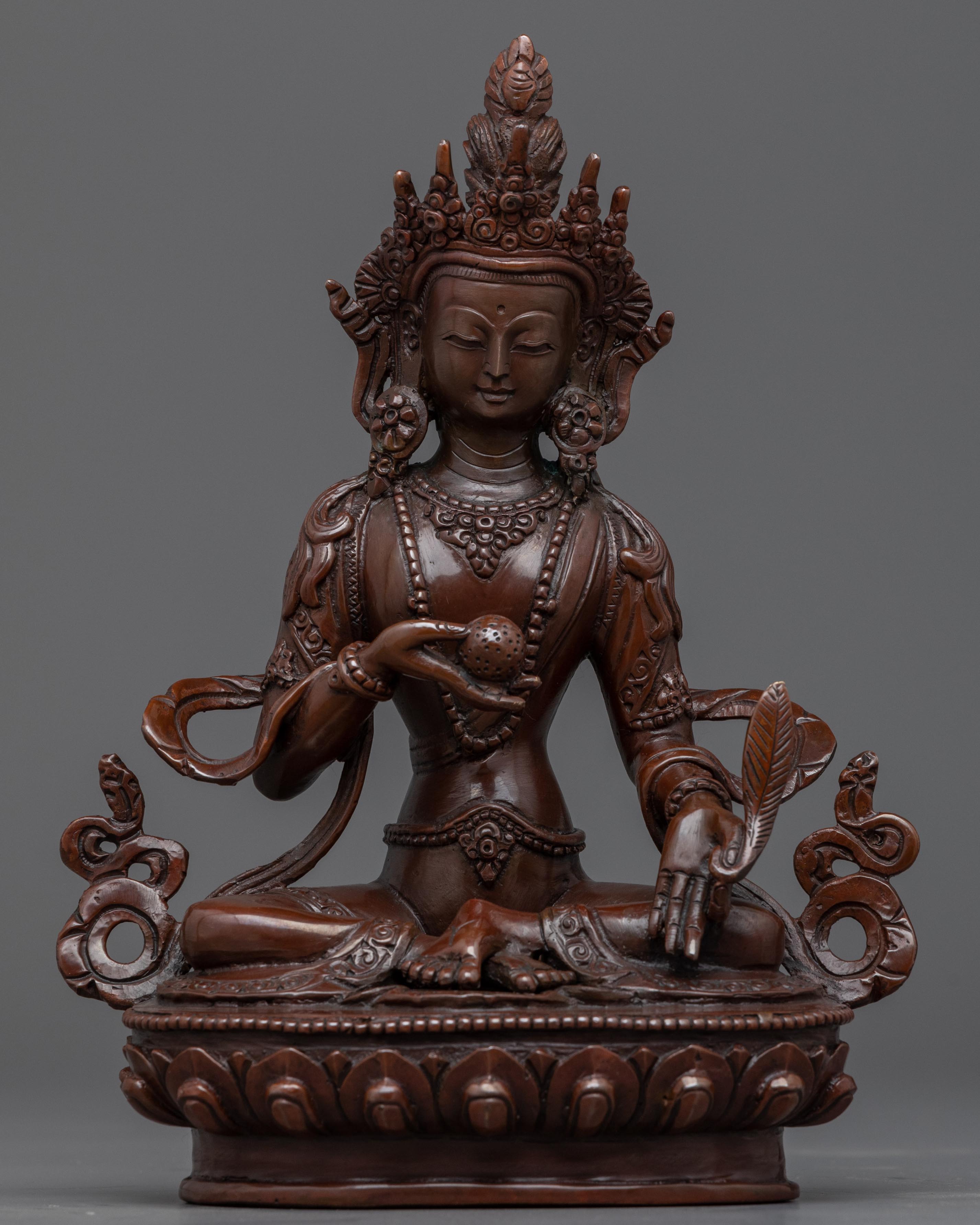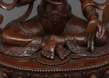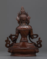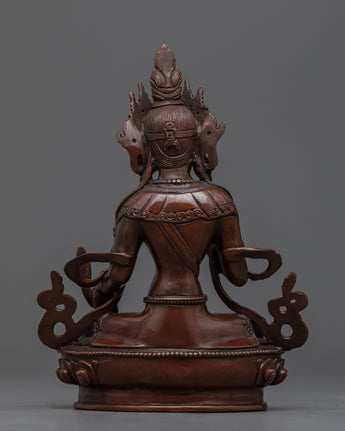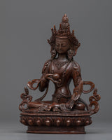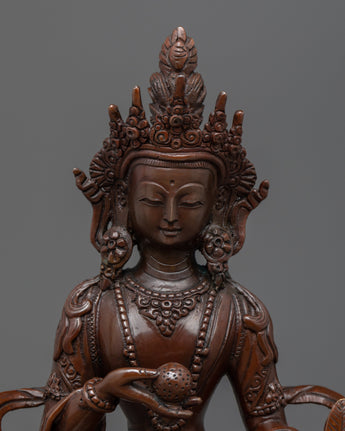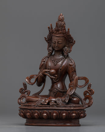 This magnificent statue of the Bodhisattva Ksitigarbha was created by a team of sculptors from Kathmandu, Nepal, using traditional Himalayan art in our studio. He is depicted sitting on a lotus seat and wearing exquisitely designed jewelry. He has a pearl in his right hand that has unfathomable magical qualities. The Varada mudra, which means "gift offering," is also seen on his left hand. His headpiece, which resembles lotus petals, looks appealing in his hair with more gems on top. We molded the figurine using oxidized copper. All the intricate attributes of the deity are hand-carved.