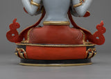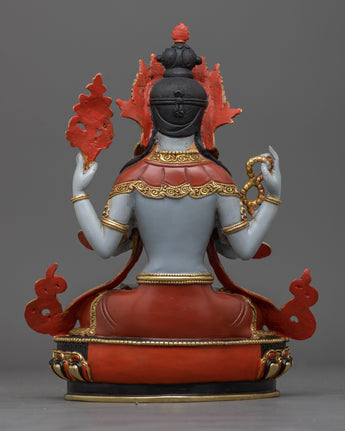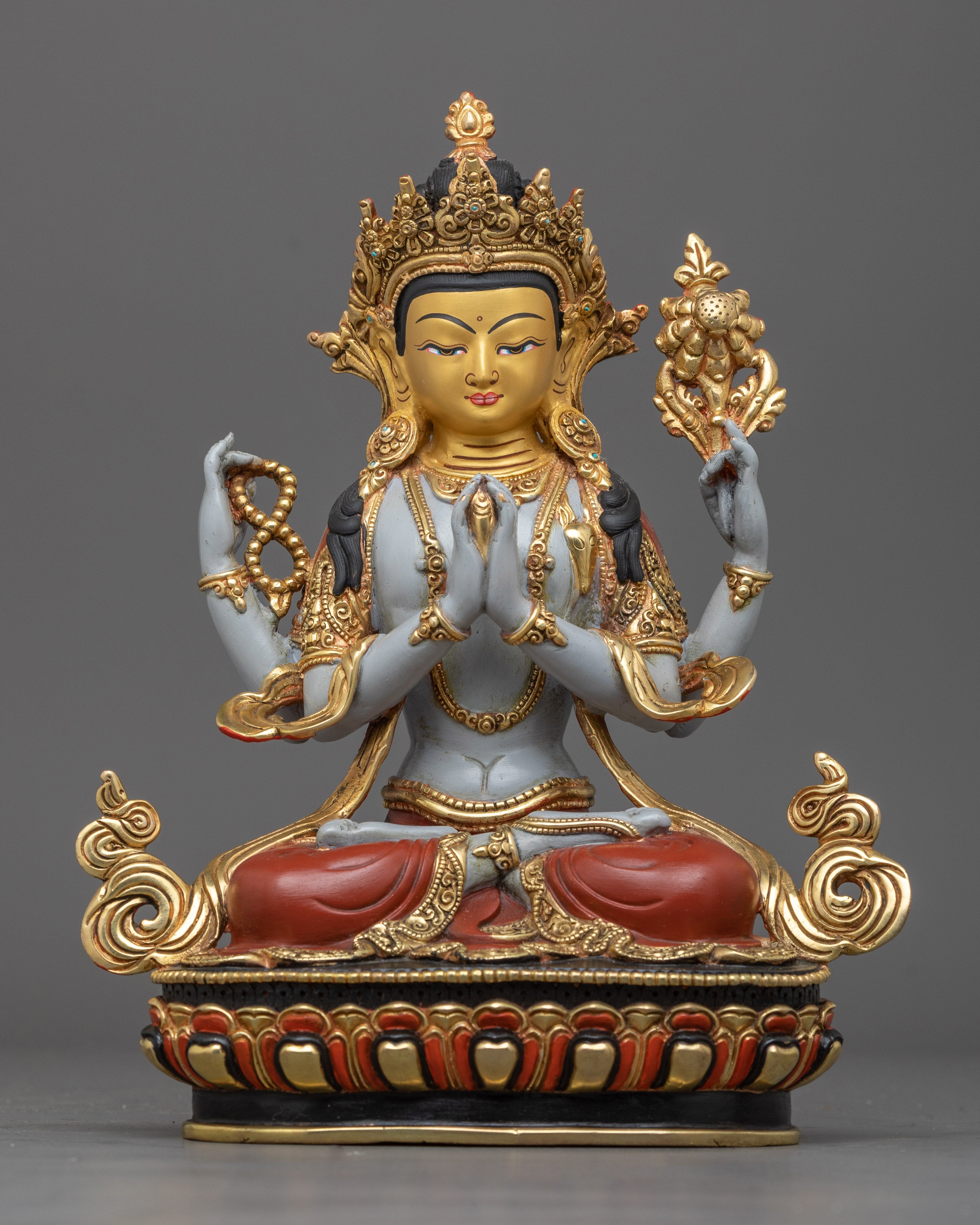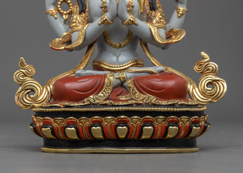 Accept the infinite kindness of the Bodhisattva Lokeshvara with our magnificent statue, painstakingly fashioned to enlighten your spiritual path. This statue, which is 9.45 inches tall and 7.68 inches wide, exudes kindness and love and provides comfort to everybody who comes to be in its presence. Encrusted with elaborate paintings in gold and acrylic, this statue embodies the spirit of Chenrezig, the personification of wise compassion. Every aspect of the Bodhisattva, from the calm countenance to the soft glance, conveys his or her unshakeable dedication to easing the suffering of all beings.