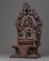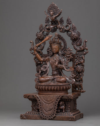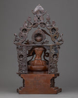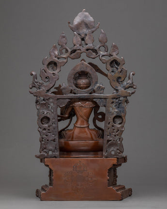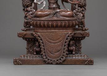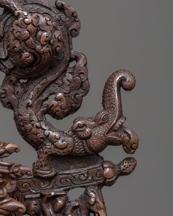 We have exquisitely hand-carved the statue of Bodhisattva Manjushri in traditional Buddhist Art. We have depicted a deity on top of a moon disc lotus throne, standing by carrying a wisdom sword in his right hand while a lotus in his left hand. We have also placed a wisdom book just above the lotus, which is mesmerizing. The design of the throne, sculpted in a Himalayan style, and crafted the body in an oxidized copper body, is magnificent and took more than a month for us to sculpt. You can use this art for multiple purposes like in your regular meditational or yoga activities, on different Buddhist occasions, and even for indoor home show pieces. This art of Himalayan will be a tremendous gift from Nepal to a suitable practitioner like you.