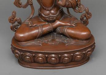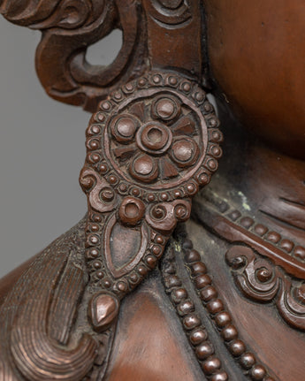 This sculpture's use of oxidized copper gives it a venerable, time-worn aspect that expresses Manjushri's ancient knowledge. The oxidation process gives the statue a rich, dark patina that enhances its depth and character, making it suitable for both classic and contemporary settings.