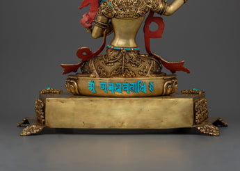 The statue depicts the deity sitting on a lotus seat atop a moon disc, holding a flaming sword of wisdom above his right hand, symbolizing its ability to remove ignorance and misconception. The figure is adorned with an elegant five-jeweled crown and a swirling silken scarf. The Prajna Paramita Sutra, held atop the lotus in the left hand doing Vitraka Mudra, represents enlightenment and knowledge in its calm and delicately created shape. Further, the statue is honoured in a throne to enhance it's importance and elegance with small flawless detailings.