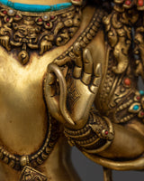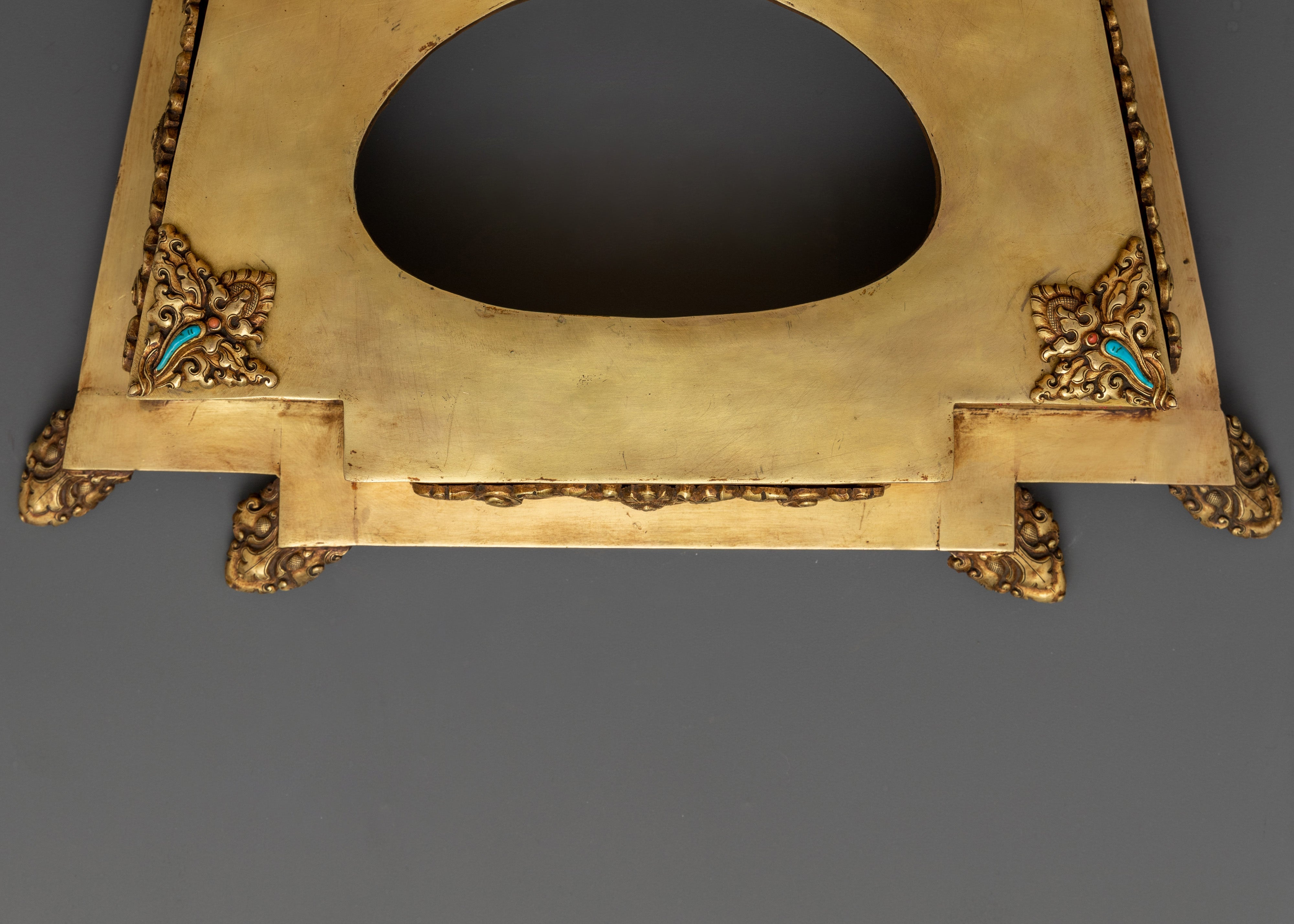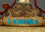 This Manjushri with Throne statue, at 19.3 inches tall with a 17.1-inch base, embodies the Buddha of Wisdom's profound wisdom and compassionate nature. Crafted from copper and exquisitely embellished with 24K gold gilding, gold and acrylic paintings, and precisely hand-carved gemstones, this amazing item weighs 6.76 kg and exudes both beauty and spiritual meaning.
