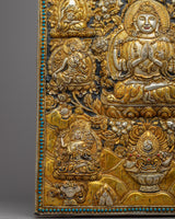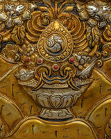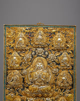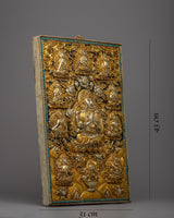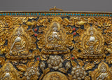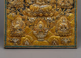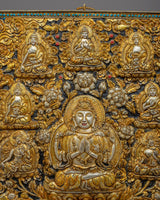 Behold the ethereal beauty of the Chenresig Bodhisattva Metal Thangka, a captivating masterpiece handcrafted on a resplendent copper body. Glistening with gold and silver plating, this Thanka calendar is a divine fusion of artistic brilliance and sacred symbolism. Graceful and rectangular in shape, it showcases Chenresig surrounded by an array of other deities, each exquisitely detailed and exuding spiritual grace. Embrace the divine presence in your living space, as this Metal Thangka becomes a portal to higher realms, illuminating your path with compassion, wisdom, and enlightenment.