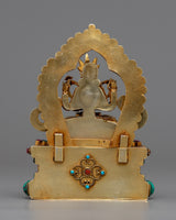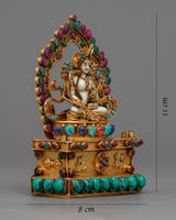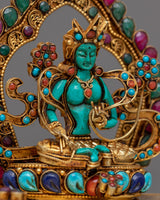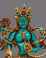 The exquisitely crafted statues of Manjushri and Green Tara, crafted from turquoise, evoke a sense of tranquil beauty and embody the wisdom-enhancing qualities of the stone.