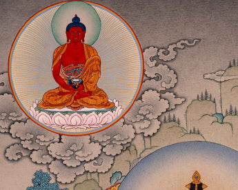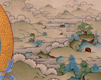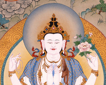 The Bodhisattva Thangka has been hand-painted by Master Artisans on a cotton canvas using natural stone colors. This painting consists of Chenrezig alongside Vajrapani, Manjushri, and Amitabha Buddha. Here Chenrezig is portrayed as the main deity seated on a lotus on top of the hill. Under the blue sky, deities represent compassion, wisdom, longevity, and fearlessness, as well as the protection of Dharma. The use of natural colors alongside genuine 24K gold makes this art look mesmerizing.