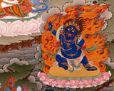 Vajrapani, holding a Diamond Scepter, is the manifestation of all of the buddhas' boundless power and the first meditational deity in this series to be depicted in a wrathful form. He has a third eye of wisdom on his forehead, and flames of wisdom energy emanate from all of his mighty body's pores. The name Vajrapani refers to the Vajra wielder, representing the power of total enlightenment.