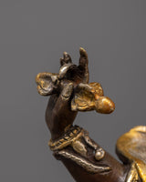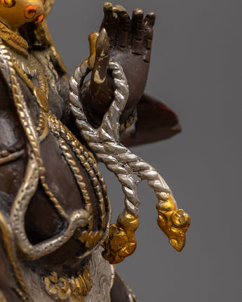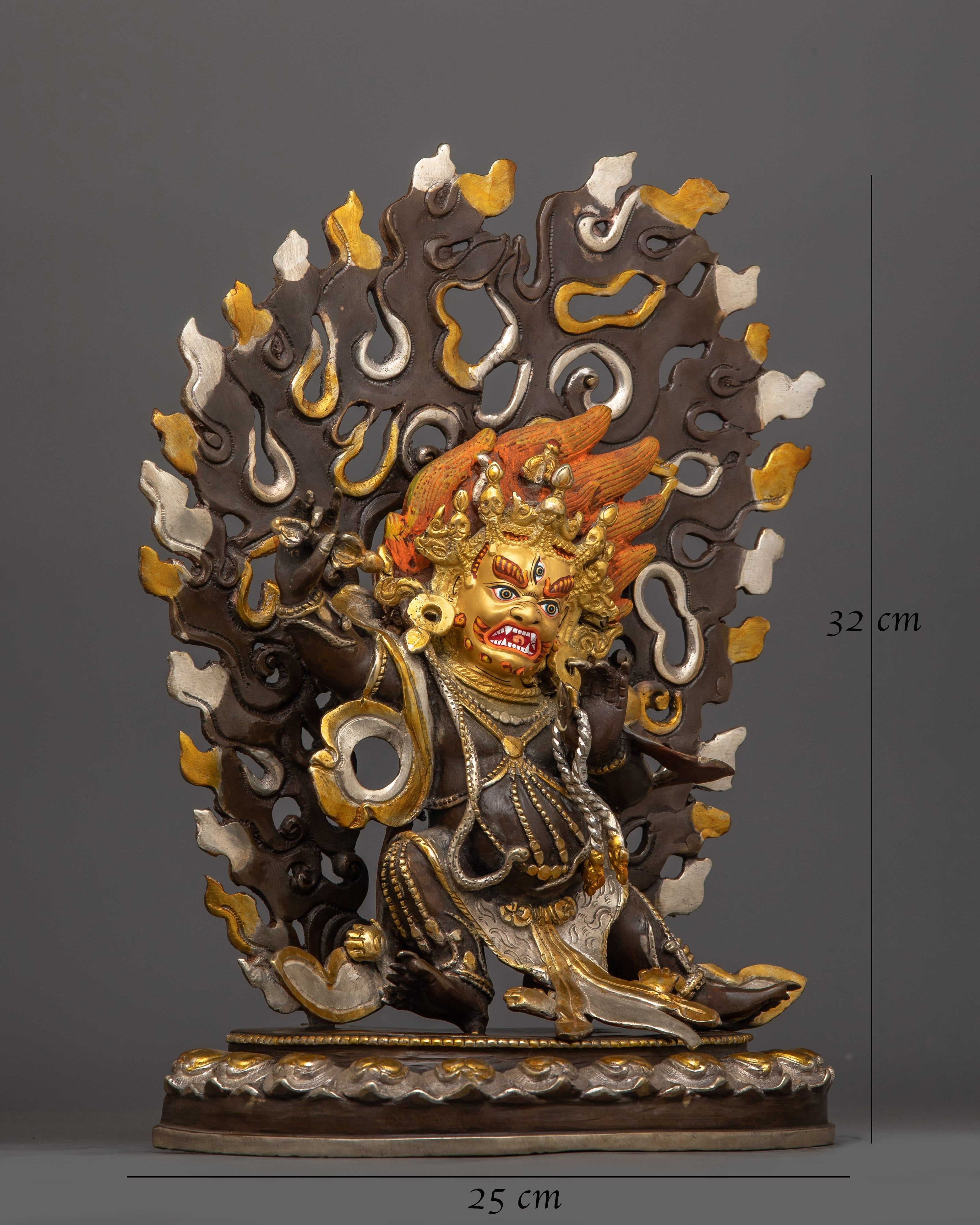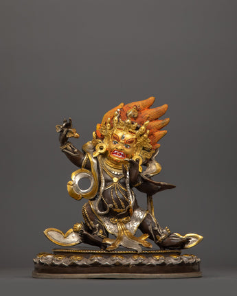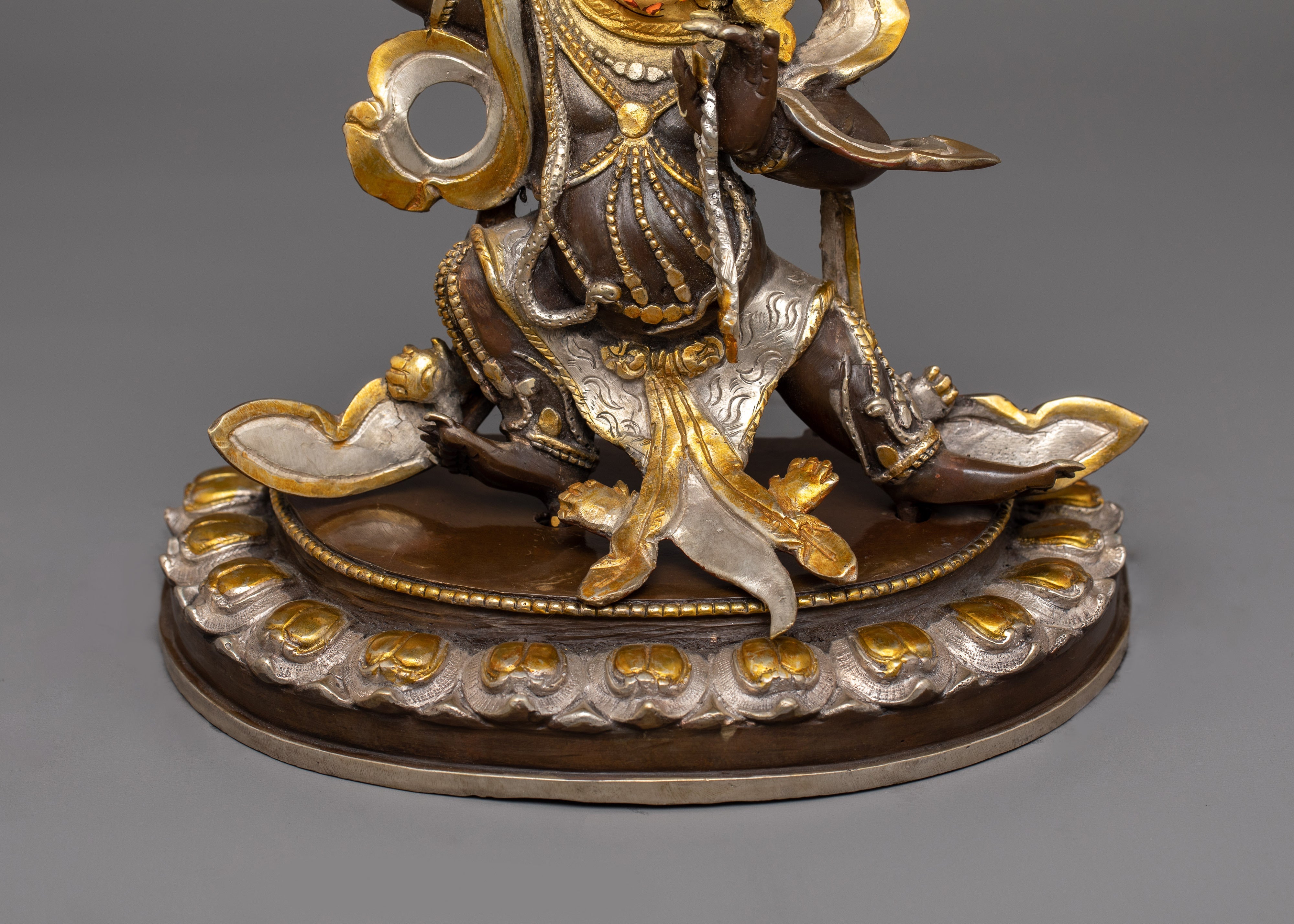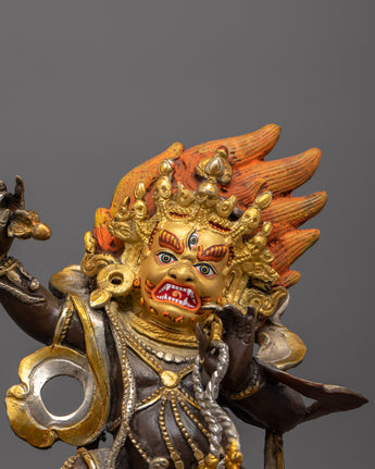Bodhisattva Vajrapani Dharma Protector Statue, a 12.6" handcrafted treasure from Nepal. This statue's oxidized copper body is carefully gilded with 24K gold and enhanced with silver plating and delicate acrylic paintings. With a powerful yet compact shape, this 7.27 kg sculpture radiates the power and protection of Vajrapani, one of Buddhism's revered guardians.