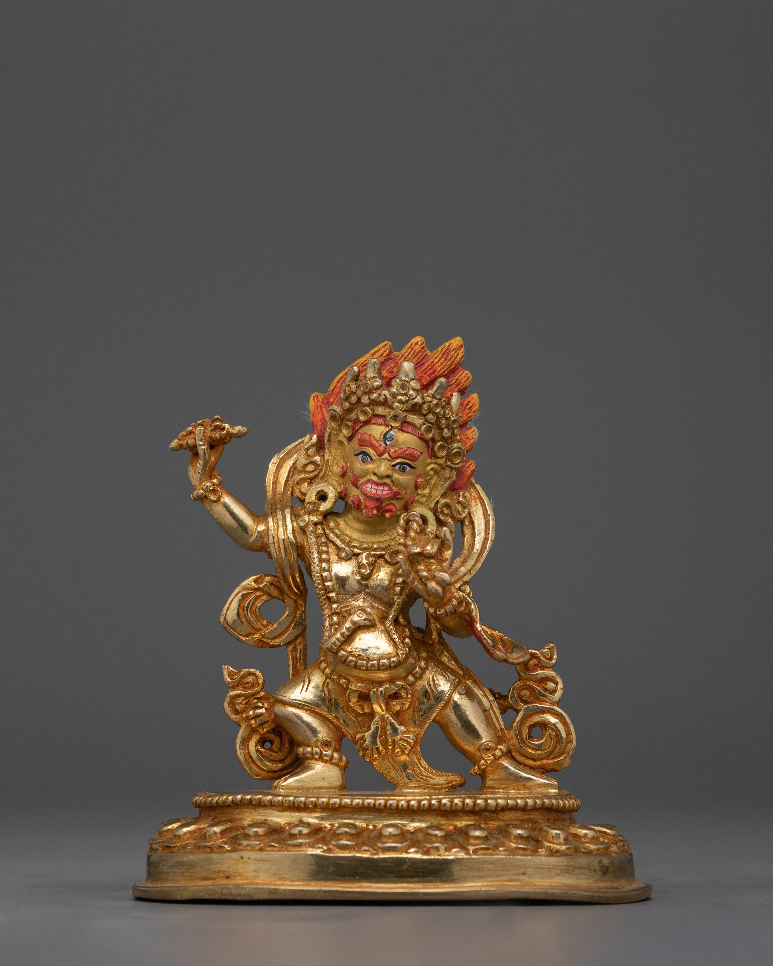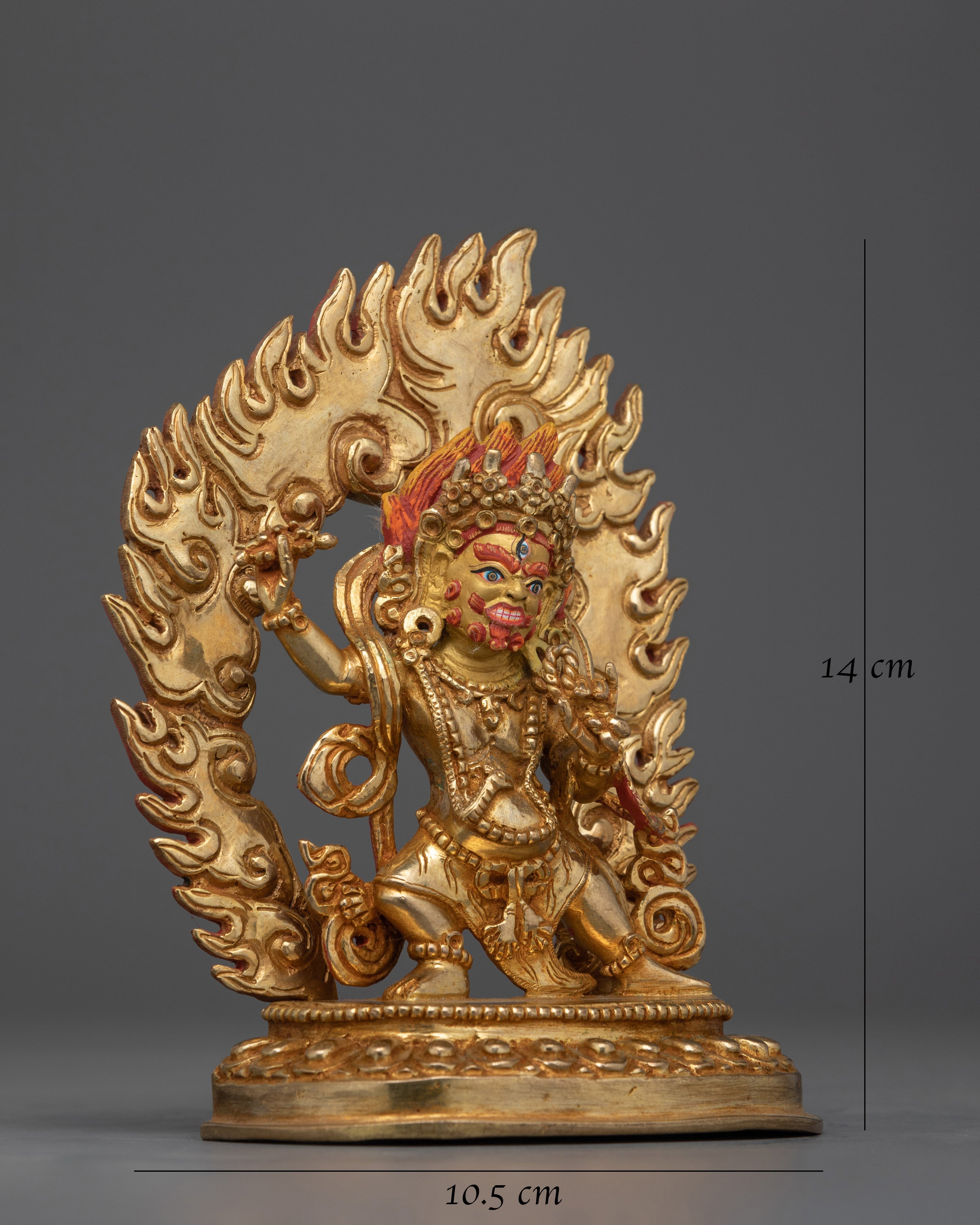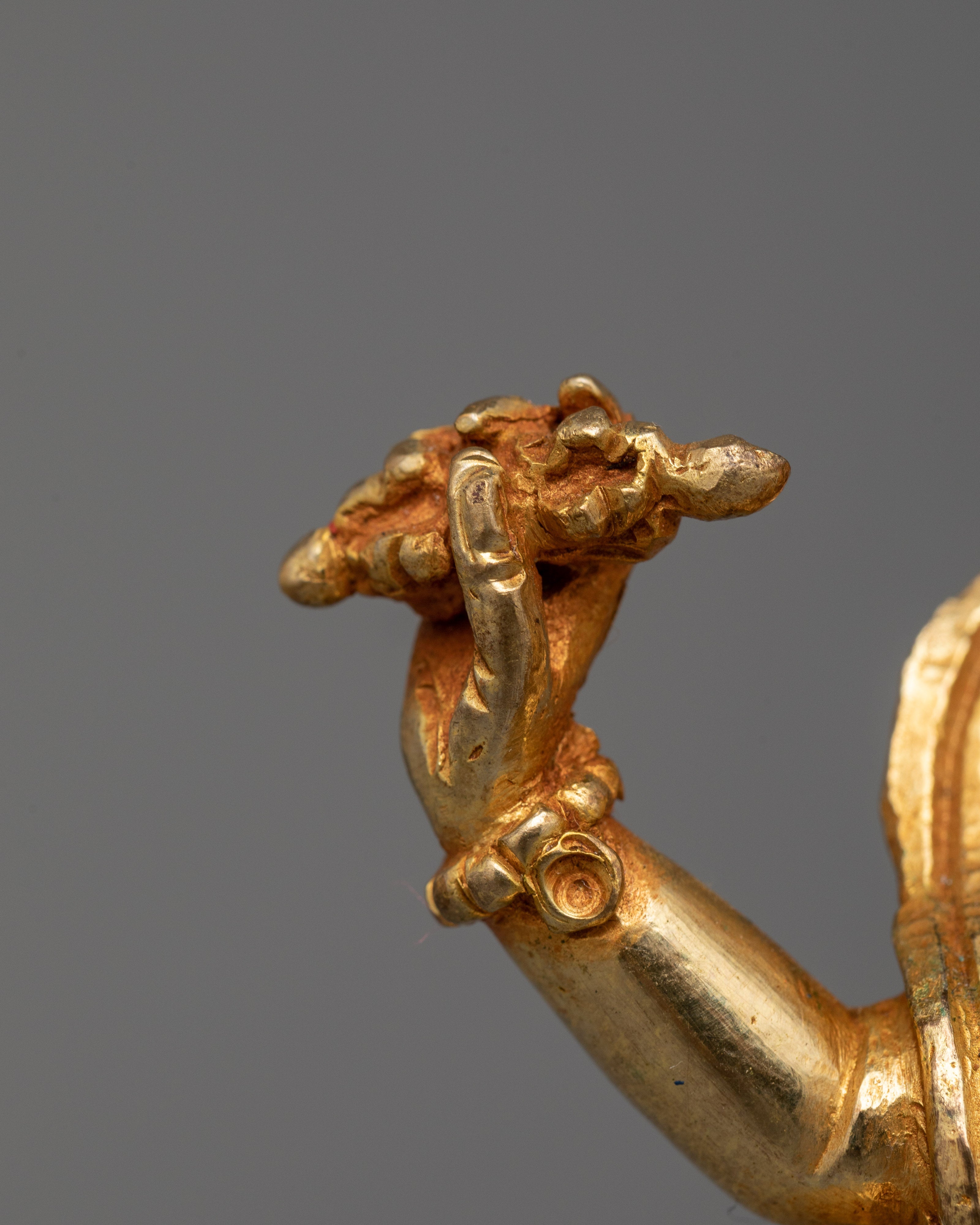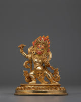 The Vajrapani Dharma Protector Statue is a potent symbol of protection, strength, and spiritual vigilance. This wonderfully created statue, standing at 5.5"/14cm in height and 4.1"/10.5cm at the base and weighing 0.590 kg, is made from a copper body gilded in 24K gold, with delicate gold and acrylic paintings that bring Vajrapani's violent yet compassionate personality to life. As the protector of the Buddha's teachings, Vajrapani's presence in your home or shrine serves as a potent reminder of spiritual strength and protection.