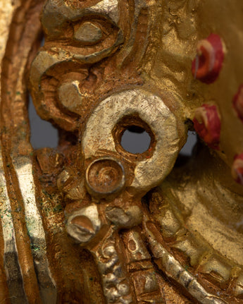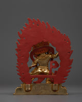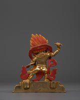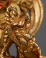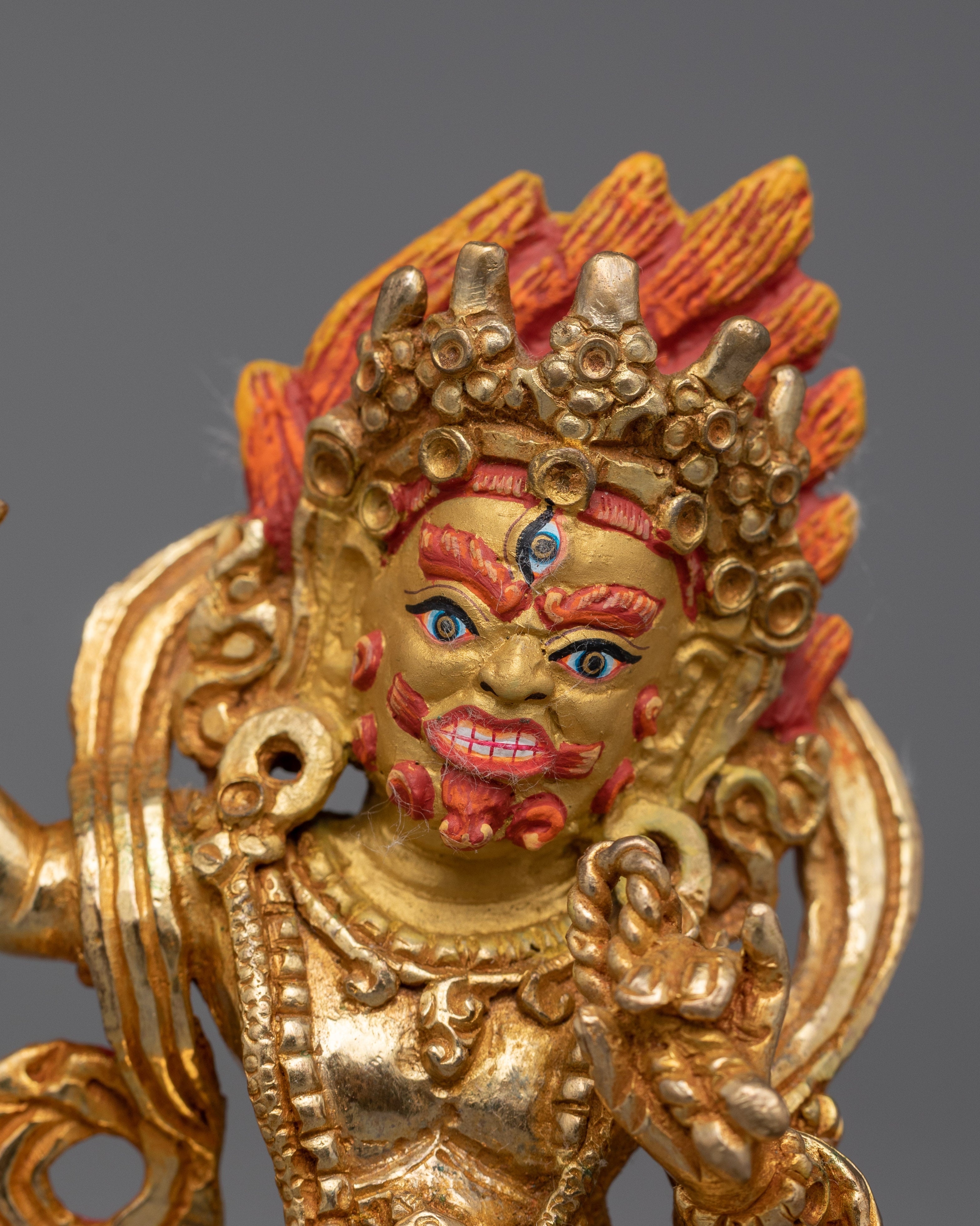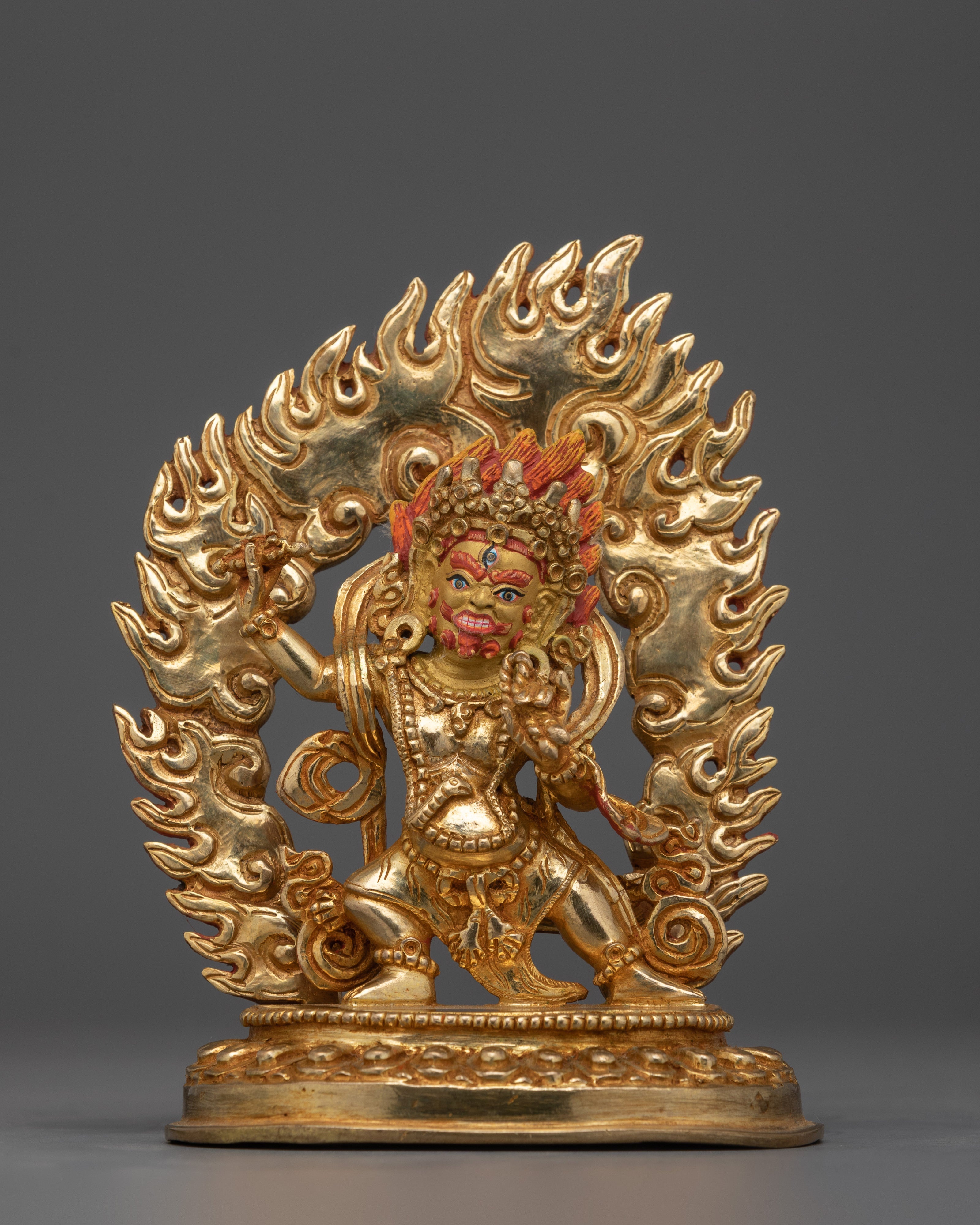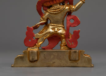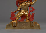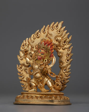 The Vajrapani Dharma Protector Statue is a potent symbol of protection, strength, and spiritual vigilance. This wonderfully created statue, standing at 5.5"/14cm in height and 4.1"/10.5cm at the base and weighing 0.590 kg, is made from a copper body gilded in 24K gold, with delicate gold and acrylic paintings that bring Vajrapani's violent yet compassionate personality to life. As the protector of the Buddha's teachings, Vajrapani's presence in your home or shrine serves as a potent reminder of spiritual strength and protection.