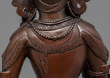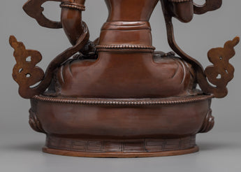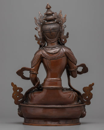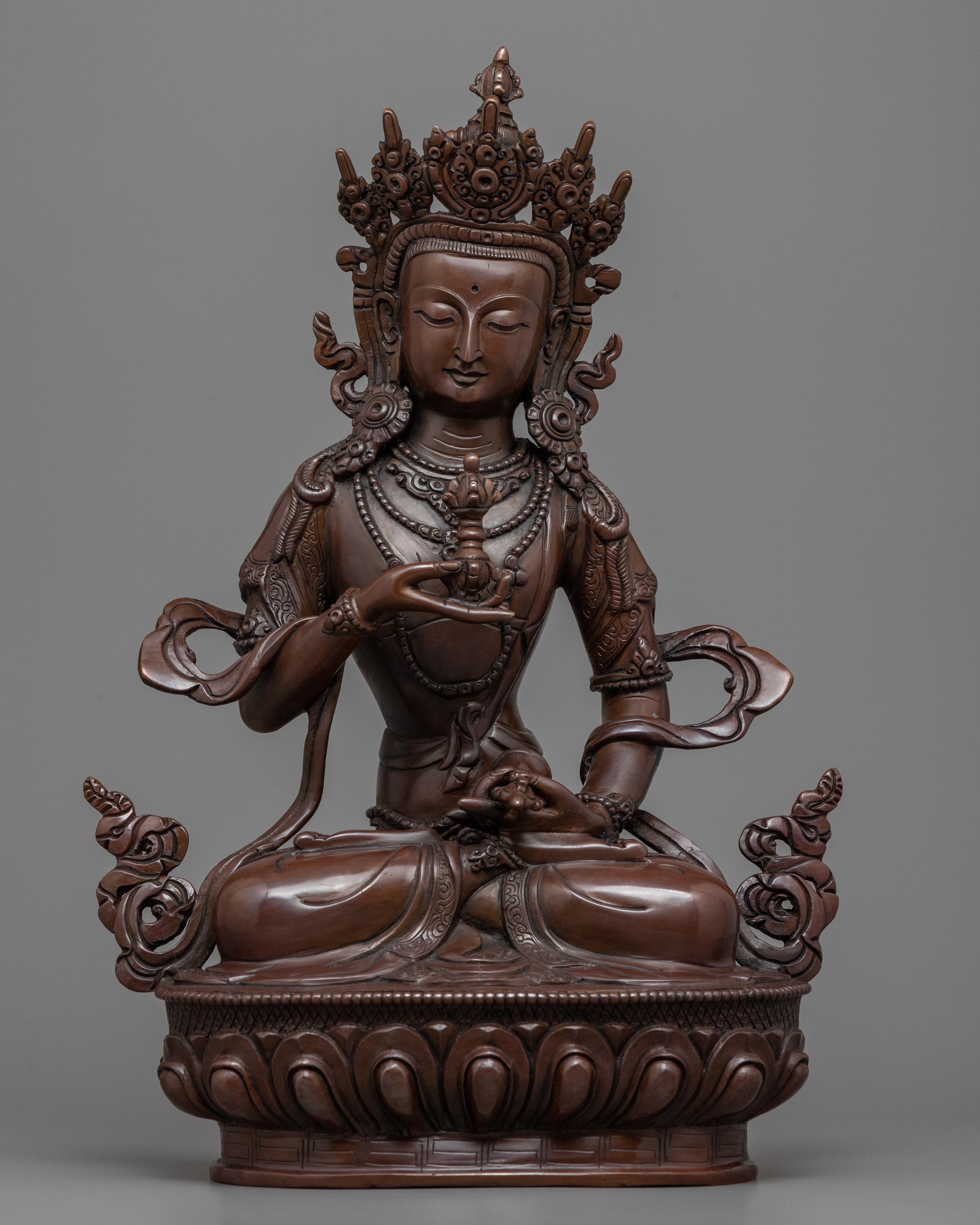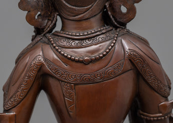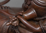 We have meticulously hand-carved this classic oxidized copper statue of Bodhisattva Vajrasattva in our studio. In the statue, the Bodhisattva gracefully sits on a moon disc flower seat in the statue, exuding sublimity, holding the vajra in his hand. He can be seen seated in a lotus posture. His headpiece, body ornaments, and the lotus seat are full of intricately detailed carvings with hammers and chisels by our traditionally skilled Vajrayan Artists.