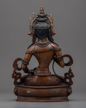 Delicately handcrafted in our workshop, the Bodhisattva Vajrasattva statue is intricately designed with unique Nepali motifs. The Bodhisattva can be observed in his typical calm and tranquil demeanor, seated on a moon disc lotus seat and in the lotus position. He carries a vajra, a ritual item that represents the impermanence and constancy of reality, in his right hand and a bell, which stands for emptiness and the sound of wisdom, in his left hand. The statue is carved out of oxidized copper, adding an element of antiquity. The partial gold gilding and acrylic painting highlight his peaceful facial expressions, while the additional gemstones to the statue adorn the deity.