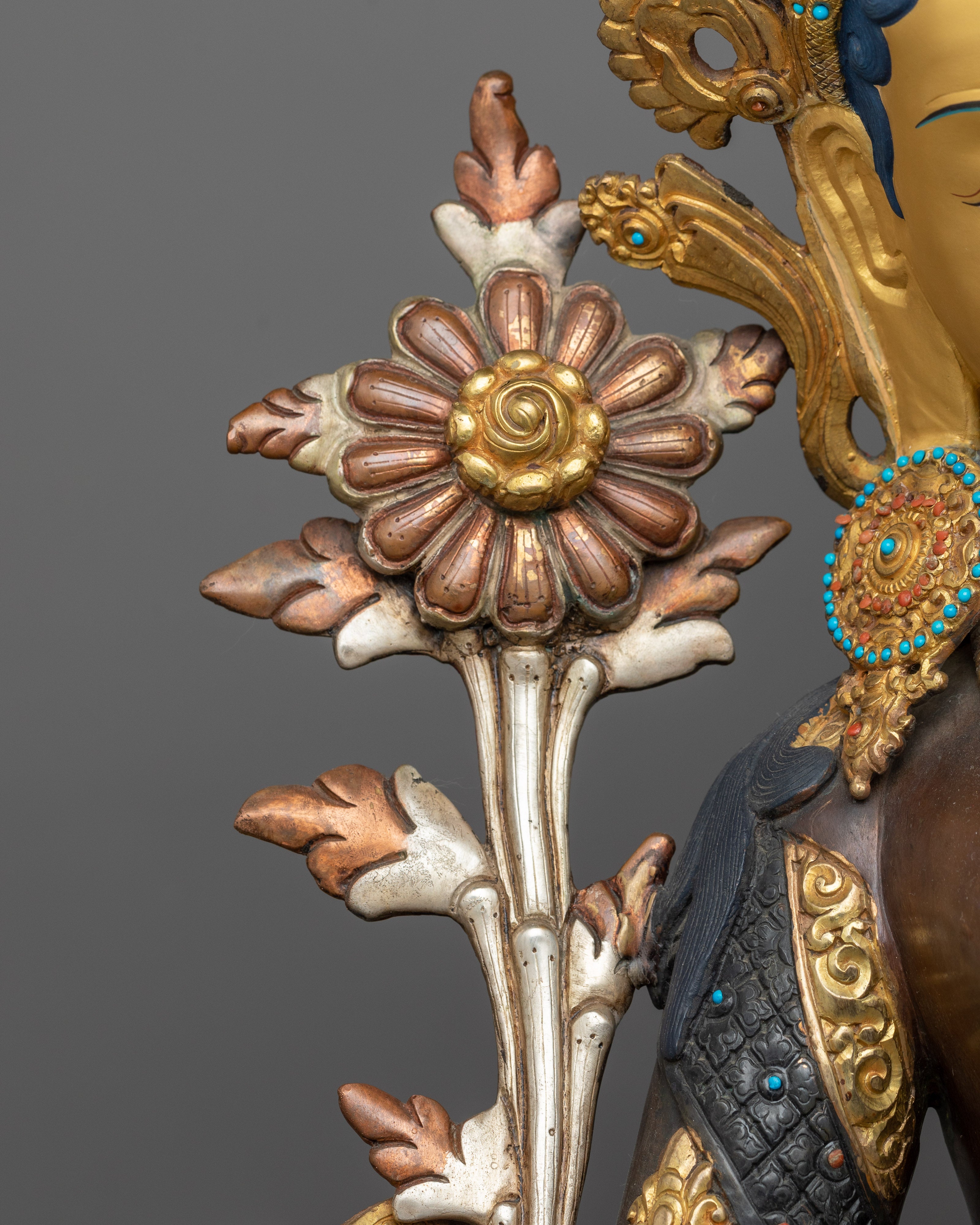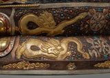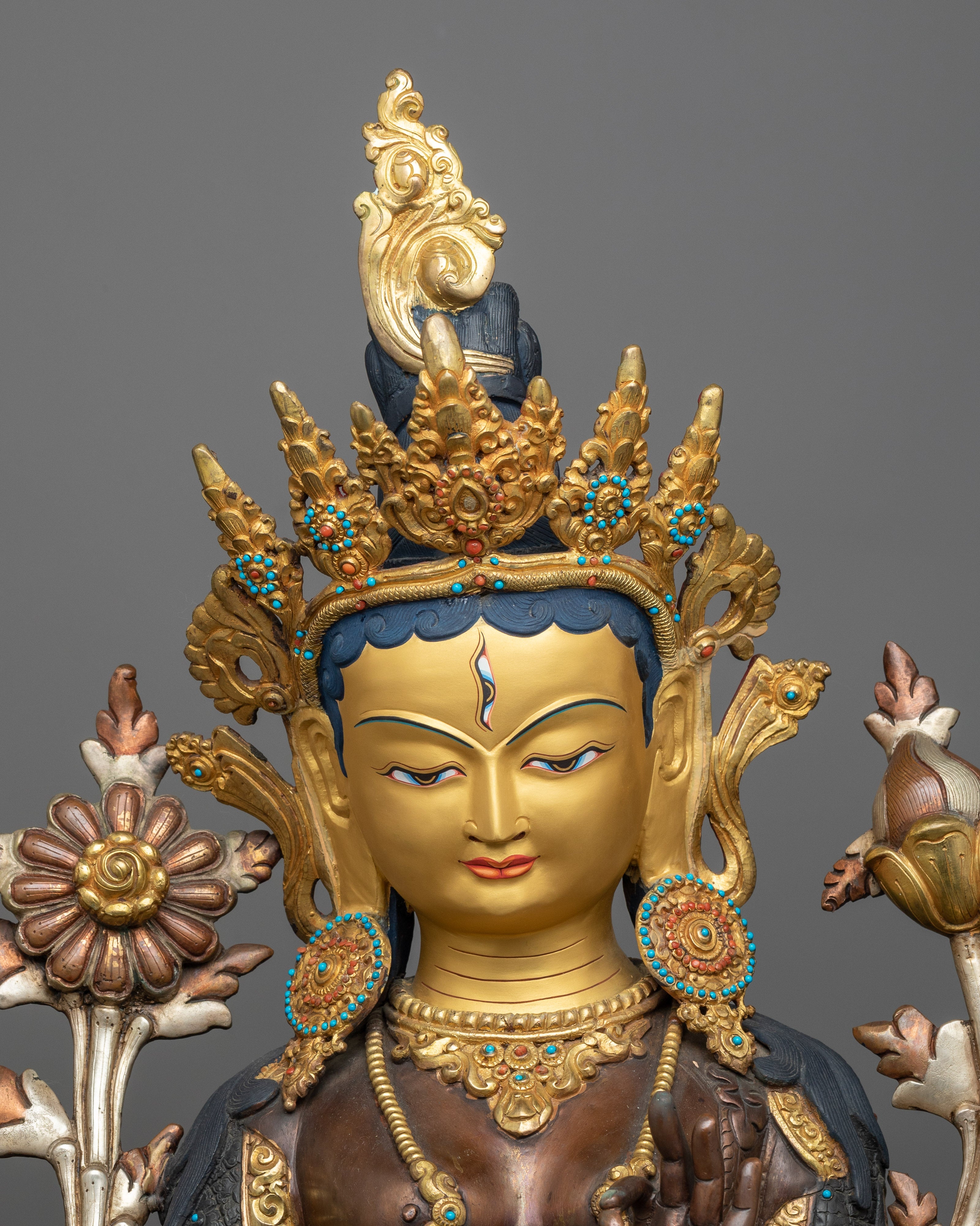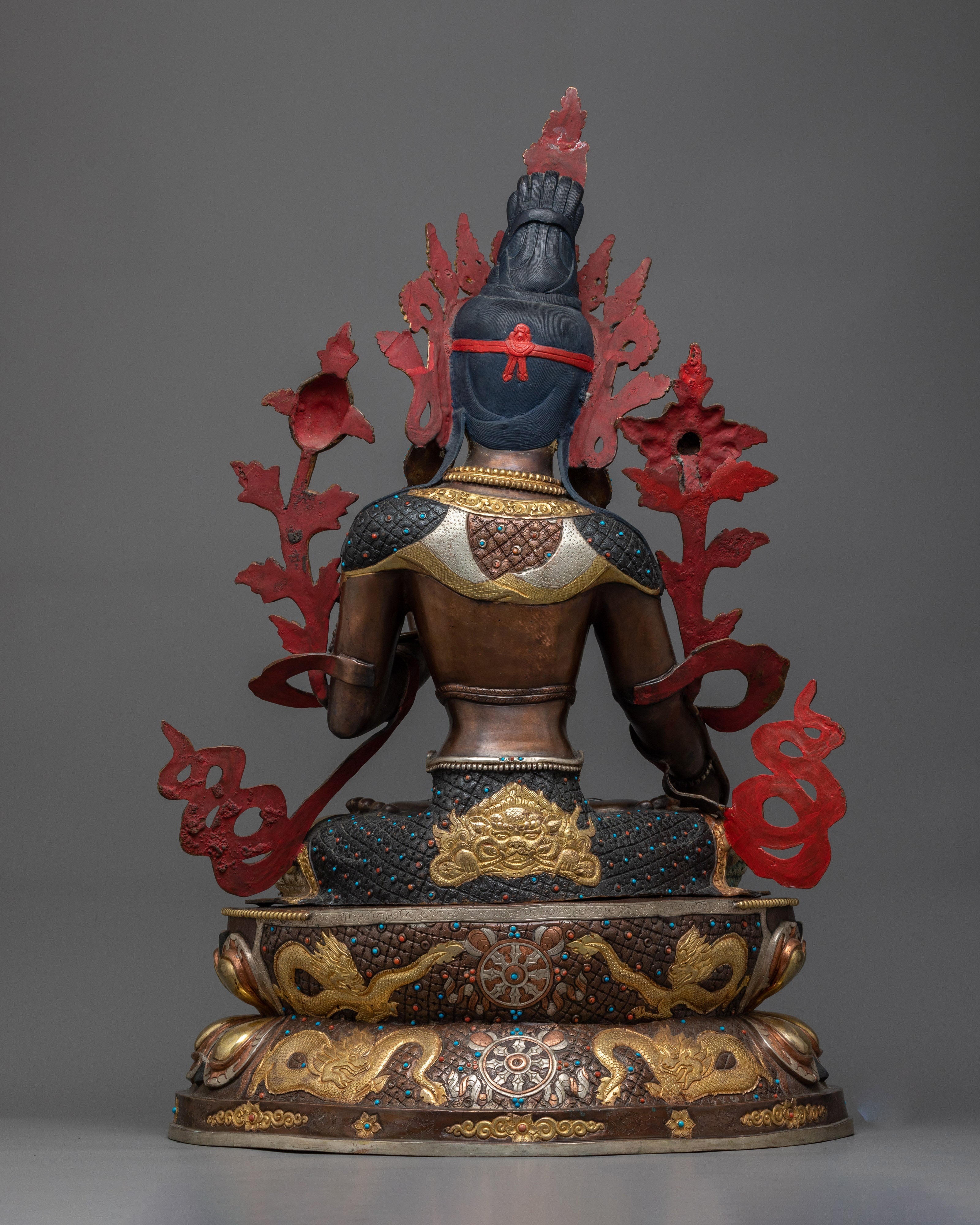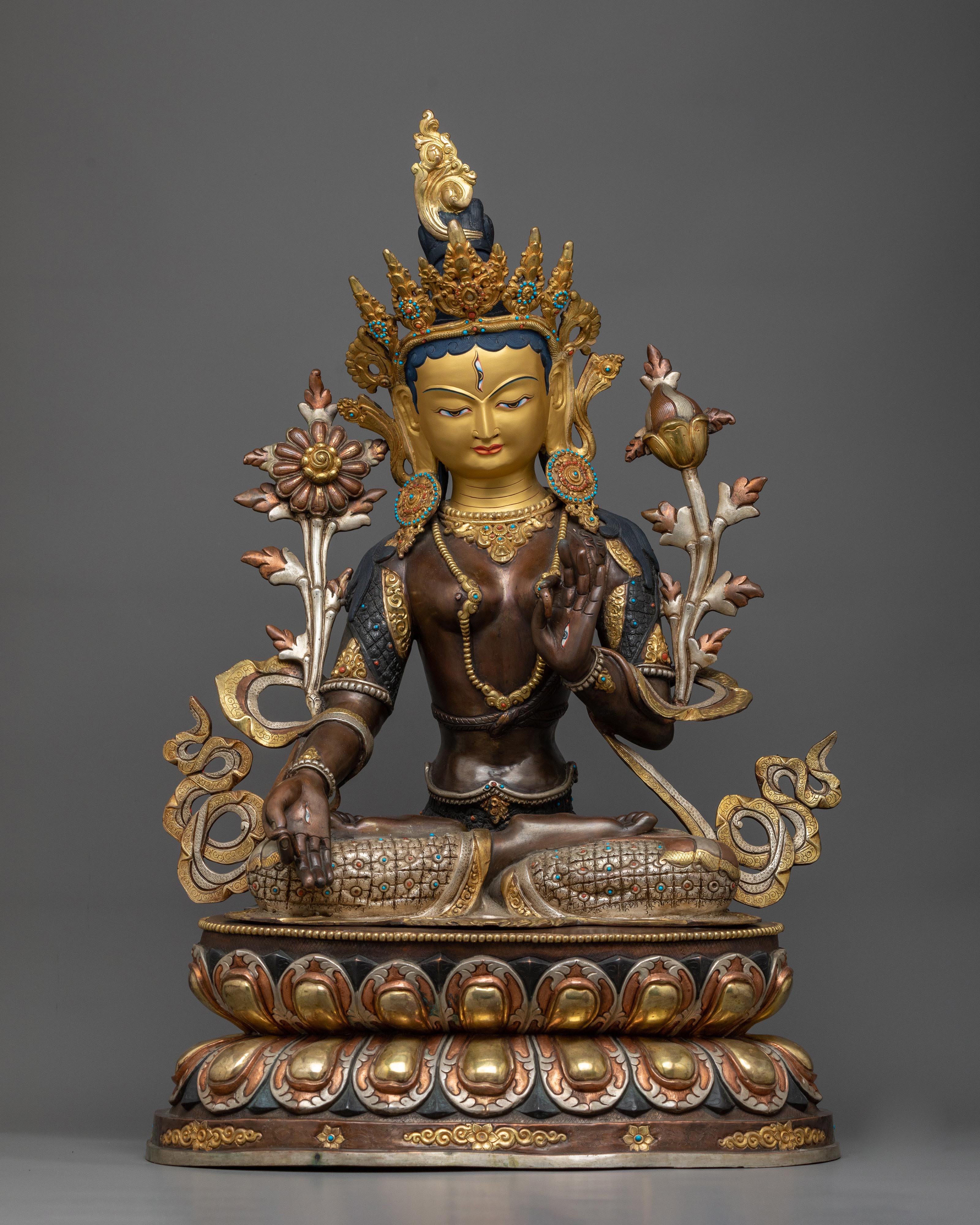 Unveil the Bodhisattva White Sita-Tara statue, representing protection, healing, and serenity. Standing tall at 27.5 inches with a base of 18.1 inches and weighing 14.22 kg, this statue embodies the gentle and protective demeanor of White Sita-Tara. This masterwork, which is made of an oxidized copper body for a timeless and tranquil appearance and is embellished with 24K gold gilding and silver plating, is further enhanced with intricate gold and acrylic paintings that represent White Sita-Tara's unending compassion and protective presence.