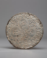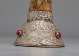 Each detail on this stamp offers a story of craftsmanship and cultural legacy, eliciting admiration and respect. With a coral stone elegantly inlaid, it emanates dynamic energy and energy, representing the interdependence of all living beings. The White Metal Bone Stamp, whether used ceremonially or displayed as a sacred item, serves as a reminder of the natural world's great beauty and spirituality, as well as the divine's timeless wisdom.