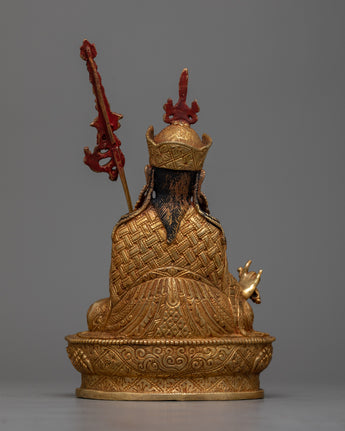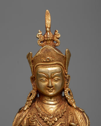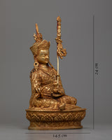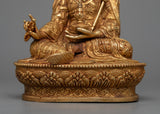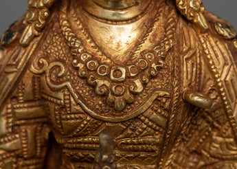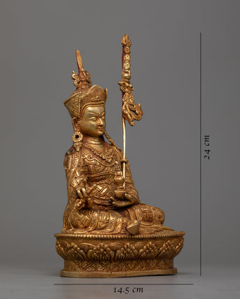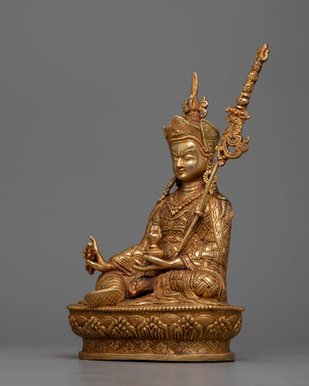 The statue's every feature, including its elaborate robes and calm countenance, conveys the respect and veneration shown for Guru Rinpoche, the esteemed teacher of Tibetan Buddhism. The exquisite craftsmanship evokes awe and reverence in those who see it by perfectly capturing the essence of Guru Rinpoche's enlightened presence.