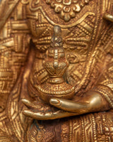 Presenting the Born From Lotus Guru Rinpoche Statue, an amazing symbol of enlightenment and commitment to the spiritual path. This statue, which is 24 cm tall and has a deep feeling of divine elegance and wisdom, was carefully created on a copper body and lavishly gilded in 24k gold.