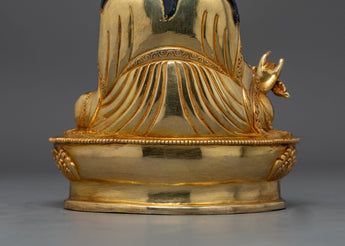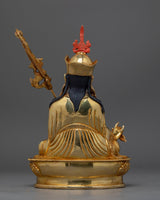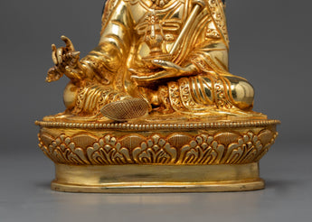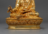 This sculpture was painstakingly crafted in Patan, the epicenter of Nepal's metalworking craftsmanship. It features a traditional copper body adorned with a stunning 24K gold gilding. This piece is a treasure of spiritual and artistic worth because of the precise gold and acrylic paints that capture the tranquil composure and enlightened aura of Padmasambhava.