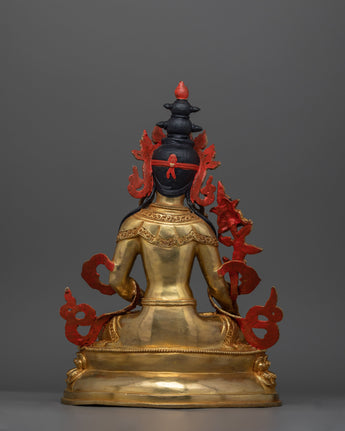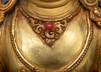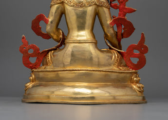 The Brahmin Maiden "Kshitigarbha" Statue, standing at 13.2 inches (33.5 cm) in height with a base width of 5.3 inches (13.5 cm), is made from copper, gilded with 24K gold, giving it a radiant and divine appearance. The intricate gold and acrylic paintings highlight the serene features of ksitigarbha, symbolizing wisdom, longevity, and spiritual vitality.