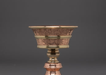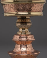 This Brass Border Butter Lamp is more than just a light source; it represents the eradication of darkness and ignorance, enlightenment, and spiritual awakening. The copper and brass combination exemplifies traditional Himalayan craftsmanship, with elaborate patterns engraved into the brass border that reflect the rich cultural legacy of Tibetan ceremonial. The huge size makes it excellent for temples, home altars, and meditation nooks, producing a warm, ambient glow that adds to the spiritual ambiance. This handcrafted ritual light embodies passion, workmanship, and cultural value, whether for personal use or as a meaningful gift for practitioners.