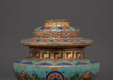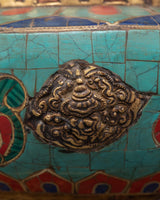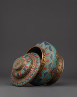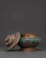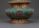 This Tibetan rice pot is not only a useful tool for ritual offerings, but also a powerful symbol of devotion and harmony. The use of turquoise, coral, and lapis lazuli enhances the pot's spiritual energy, imbuing it with beneficial and protective properties. The 0.32 kg weight lends it a solid, substantial presence, while the meticulous design underscores its profound cultural and spiritual significance. This handcrafted offering bowl can be used in meditation spaces, prayer rooms, or as a decorative spiritual object in your home, adding to the ambiance with its sacred energy and intricate design.