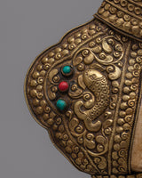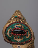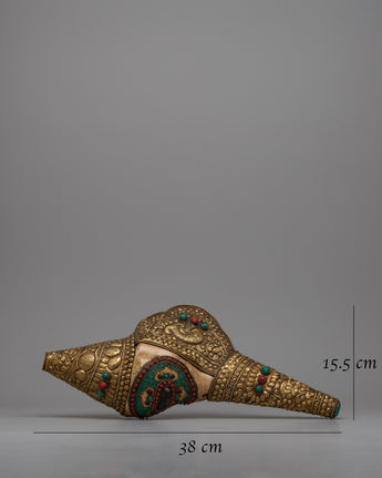 Presenting the Brass Shankh Shell, a masterfully created item that fuses delicate details with genuine elegance. Crafted from a conch shell by hand and embellished with brass, this magnificent object stands 15.5 cm tall and 38 cm wide and weighs 1.22 kg. Artificial lapis lazuli, turquoise, and coral are added to the shell to adorn it further, providing vivid hues and improving its aesthetic appeal.