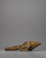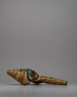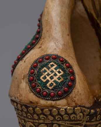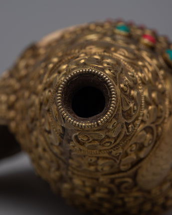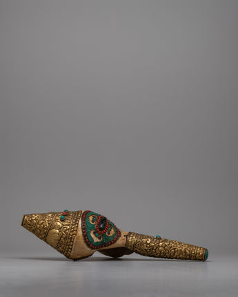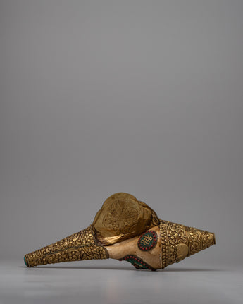 Sankh, also known as conch shell, is an essential symbol in Buddhist and Hindu traditions, signifying auspiciousness, cleanliness, and the divine sound 'Om.' This handcrafted item is perfect for collectors, art enthusiasts, and spiritual seekers. The Brass Shankh Shell adds a touch of spiritual depth and cultural richness to any environment, whether it is used in rituals, shown as a beautiful item, or placed in a holy place. Its presence evokes reflection and reverence, representing the high spiritual standards and fine craftsmanship that elevate it to a treasured addition to any collection.