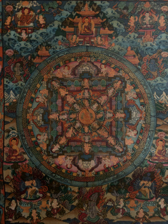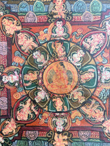 Our Buddha Mandala Thangka Painting presents a captivating portrayal of spiritual harmony and enlightenment. At the heart of the mandala, the Buddha sits in serene meditation, surrounded by an assembly of celestial beings, their presence reflecting the scene with a sense of divine harmony and tranquility. The intricate patterns and deep colors in the mandala that encapsulate this sacred imagery draw the viewer into a realm of profound spiritual depth. Bordering this sacred scene are majestic dragons complemented by a brocade of vintage green, crafted in a classic old-style vibe. This artwork stands as a timeless testament to Buddhist spirituality, inviting viewers to immerse themselves in its profound symbolism and spiritual depth.