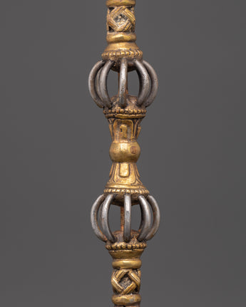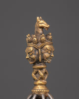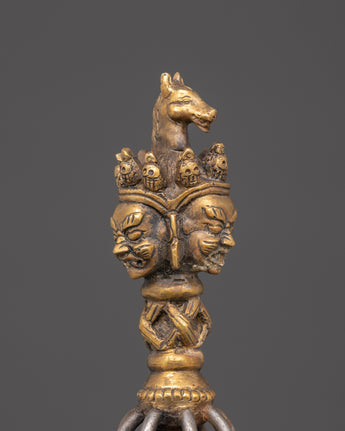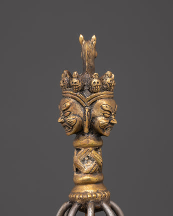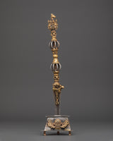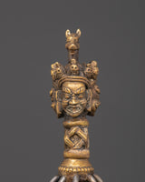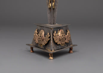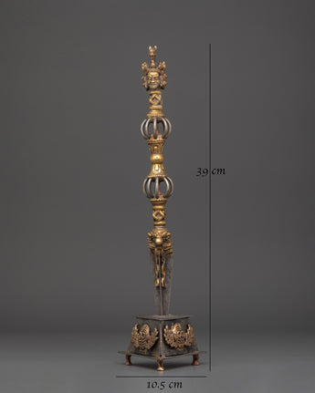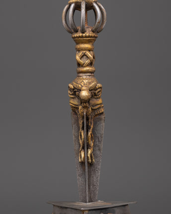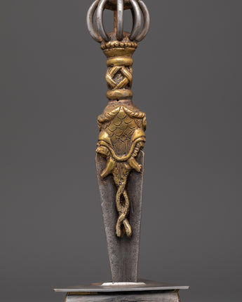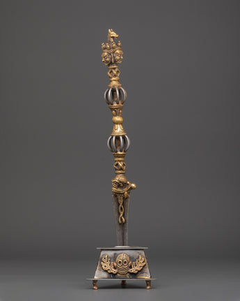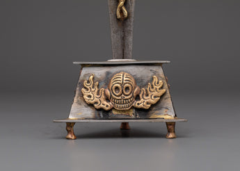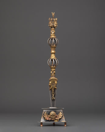 With this Bronze Made Phurba, a revered Tibetan ritual dagger used for energy cleaning, spiritual protection, and ceremonial purposes, you can unleash ancient wisdom and spiritual power. This Phurba, which is 39 cm in height and 10.5 cm in breadth, is made of bronze with an iron core and represents balance, strength, and the ability to dispel negative energy. With a weight of 1.23 kg, it provides a strong, dominating presence that is perfect for ritual use or altar display.
