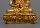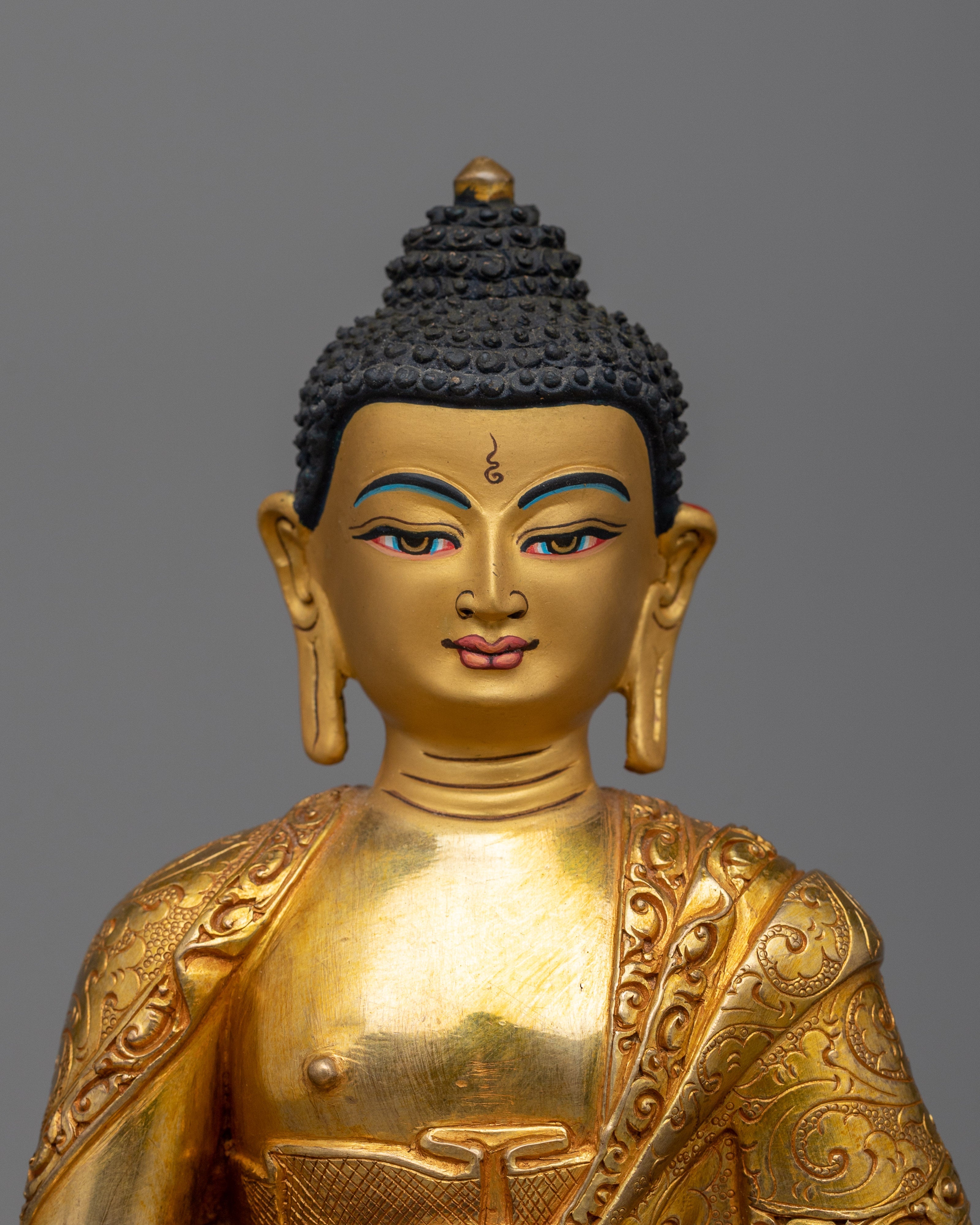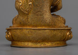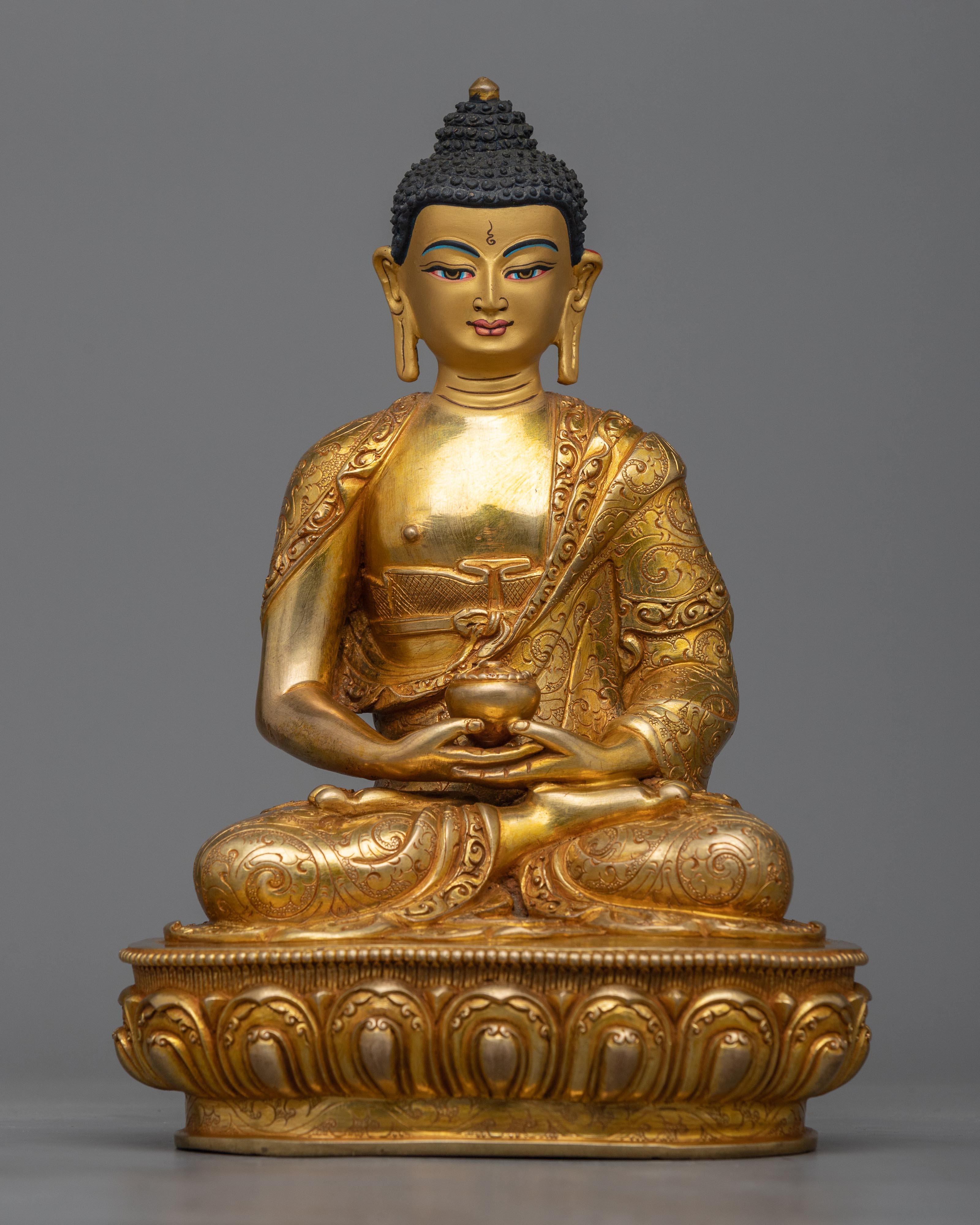 Introducing the Buddha Amitabha Gilt Sculpture, a stunning depiction of the Pure Land sect's main Buddha, representing endless light and life. This lovely figurine, at 8.6 inches tall, is the ideal size for any meditation place or altar. Weighing 1.85 kg, it is made of copper, gilded with 24K gold, and embellished with complex gold and acrylic paintings that reflect Amitabha Buddha's extraordinary artistic ability and spiritual depth.