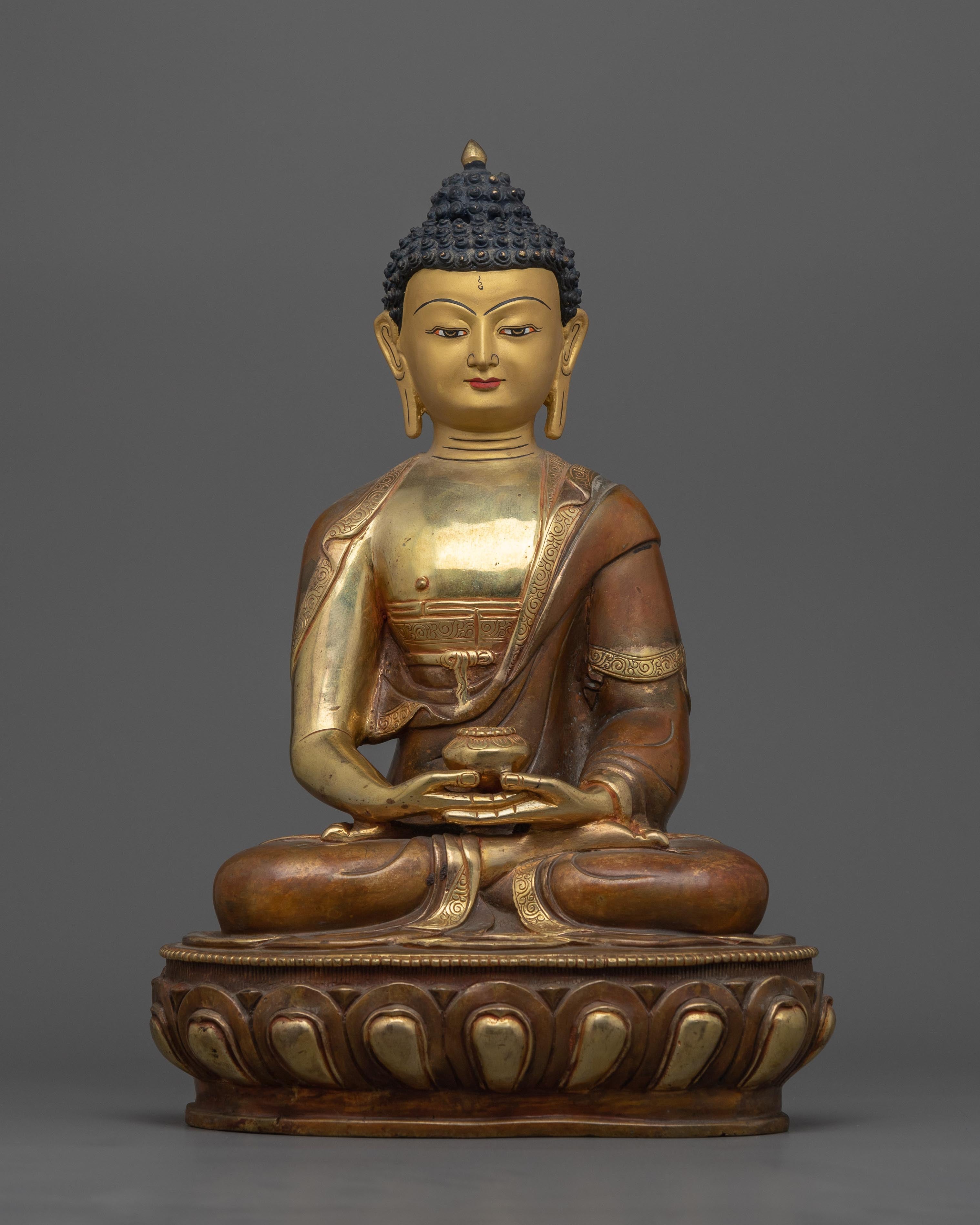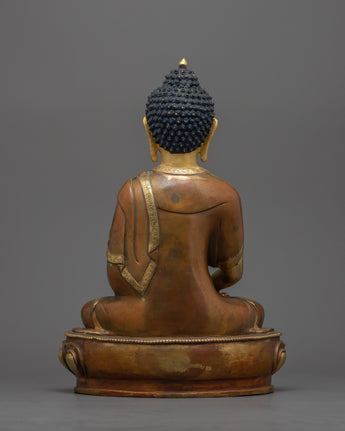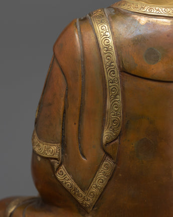 This meticulously carved statue of Buddha Amitabha in his distinctive mudra evokes a deep spiritual resonance by capturing the deity's aura in its entirety. This masterwork, which stands 12.5 inches tall, captures every feature, from the Buddha's serene facial expression to the intricate fabric of his robes. The tarnished copper body ensures longevity while adding ageless appeal, and the 24k gold gilding, mixed with bright acrylic paintings, gives the statue an ethereal light. The craftsmanship not only honors the deity but also the long history of Buddhist artwork.