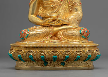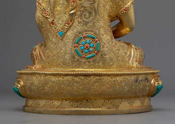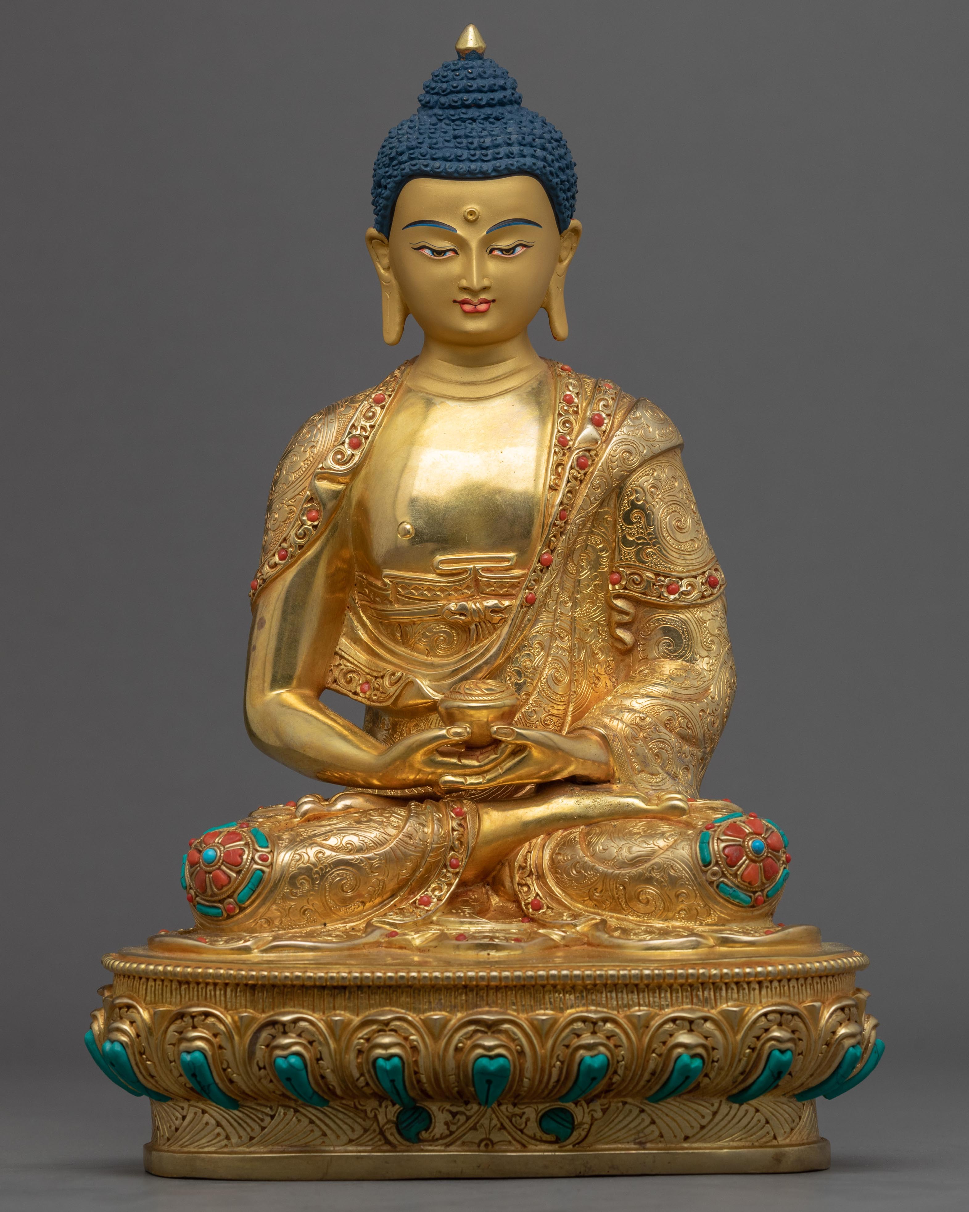 In our workshop, we sculpted this Buddha Amitabha Prayer Sculpture. For the molding of the deity, we used copper. After molding, we hand-carved intricate design patterns on the figurine using a hammer and chisels. To do delicate carvings, artists must have decades of experience as he has to create intricate design patterns on a small surface area. Then the deity is gilded using genuine 24K gold. We have adorned the statue with valuable gemstones on the robe and the lotus seat. To highlight the facial attributes of the deity, acrylic paints were used. Amitabha Buddha is depicted seated on a moon disc lotus seat in the Dhyana Aasan or meditative position. holding a vas in both hands.